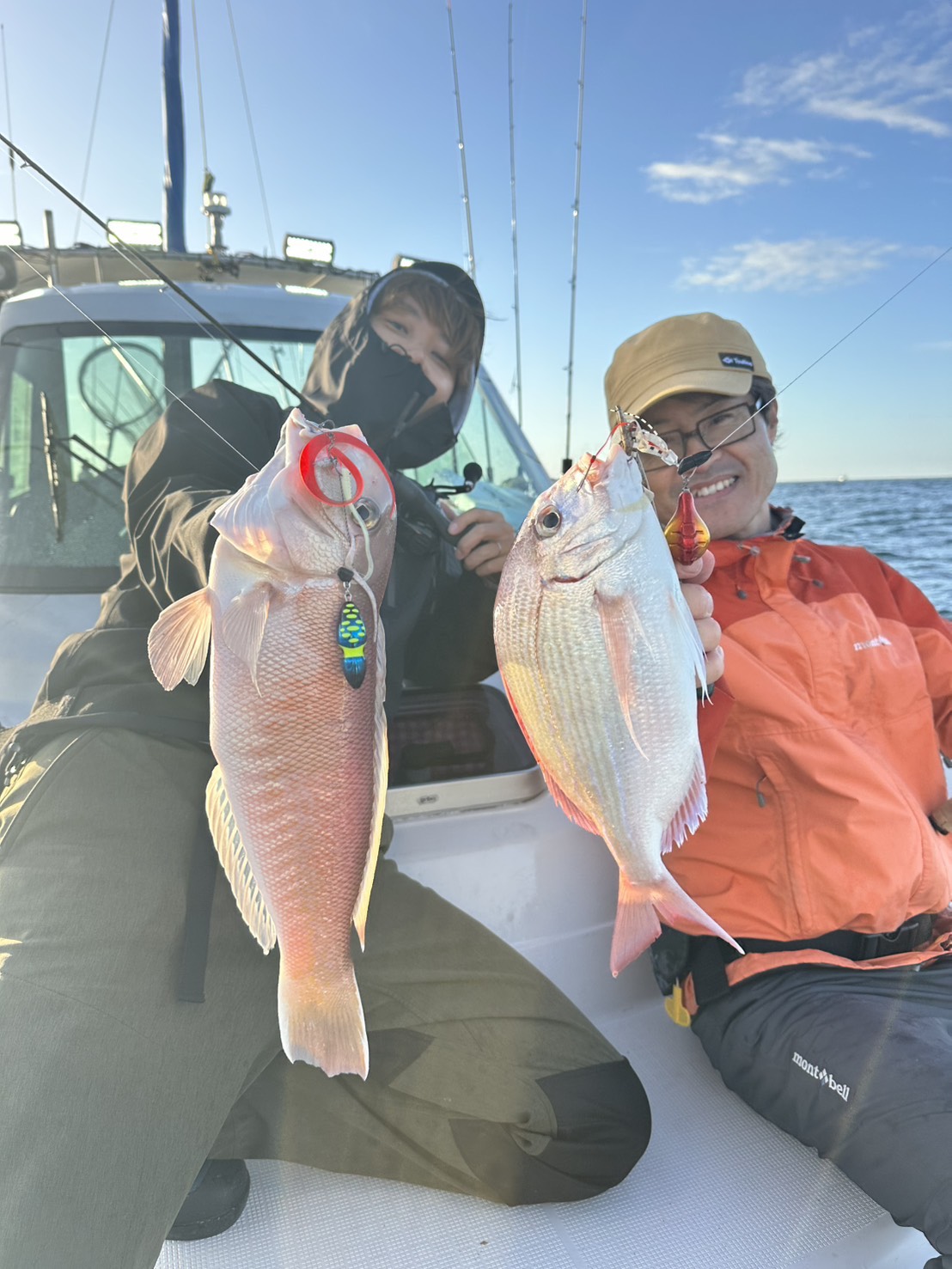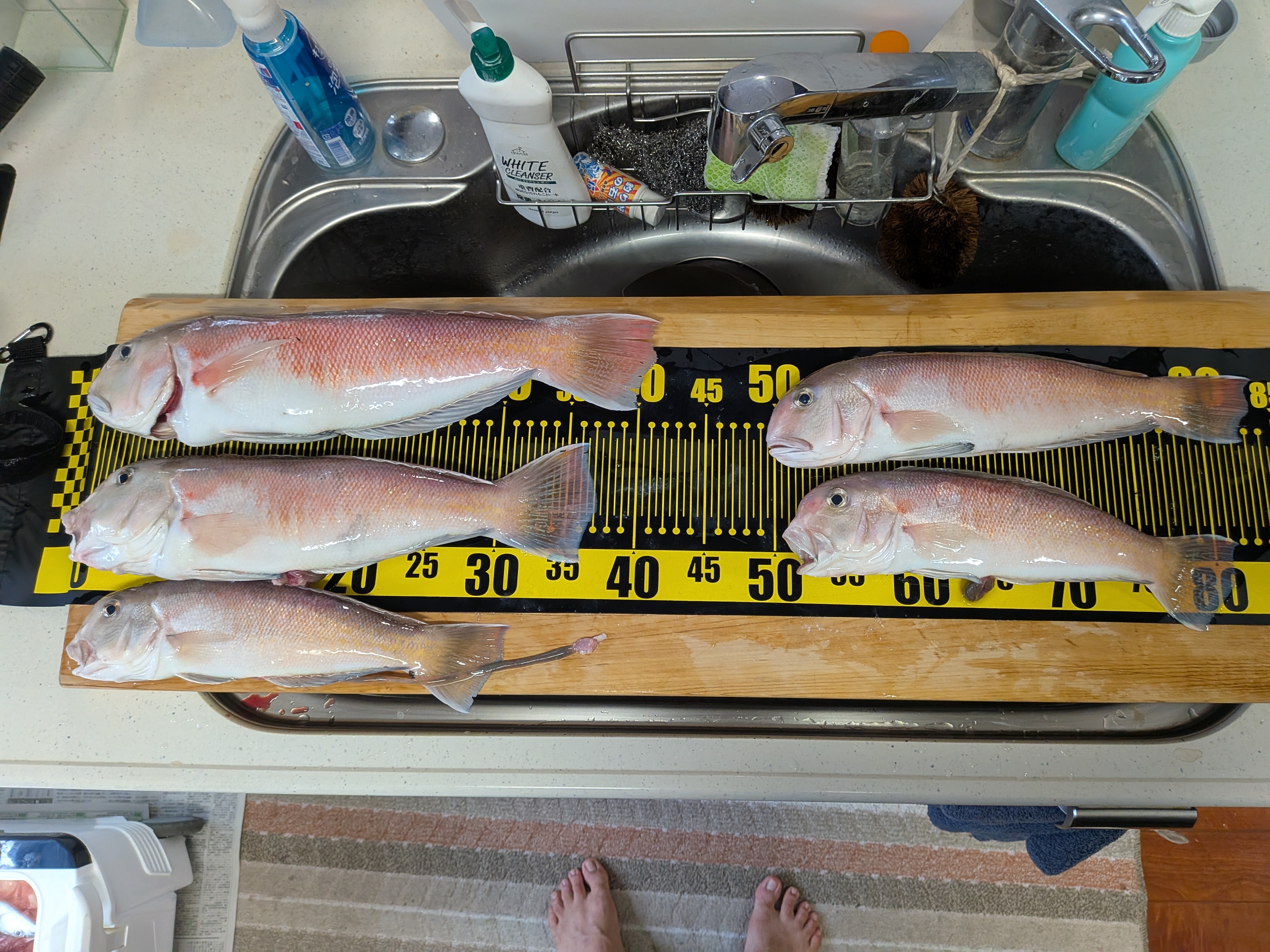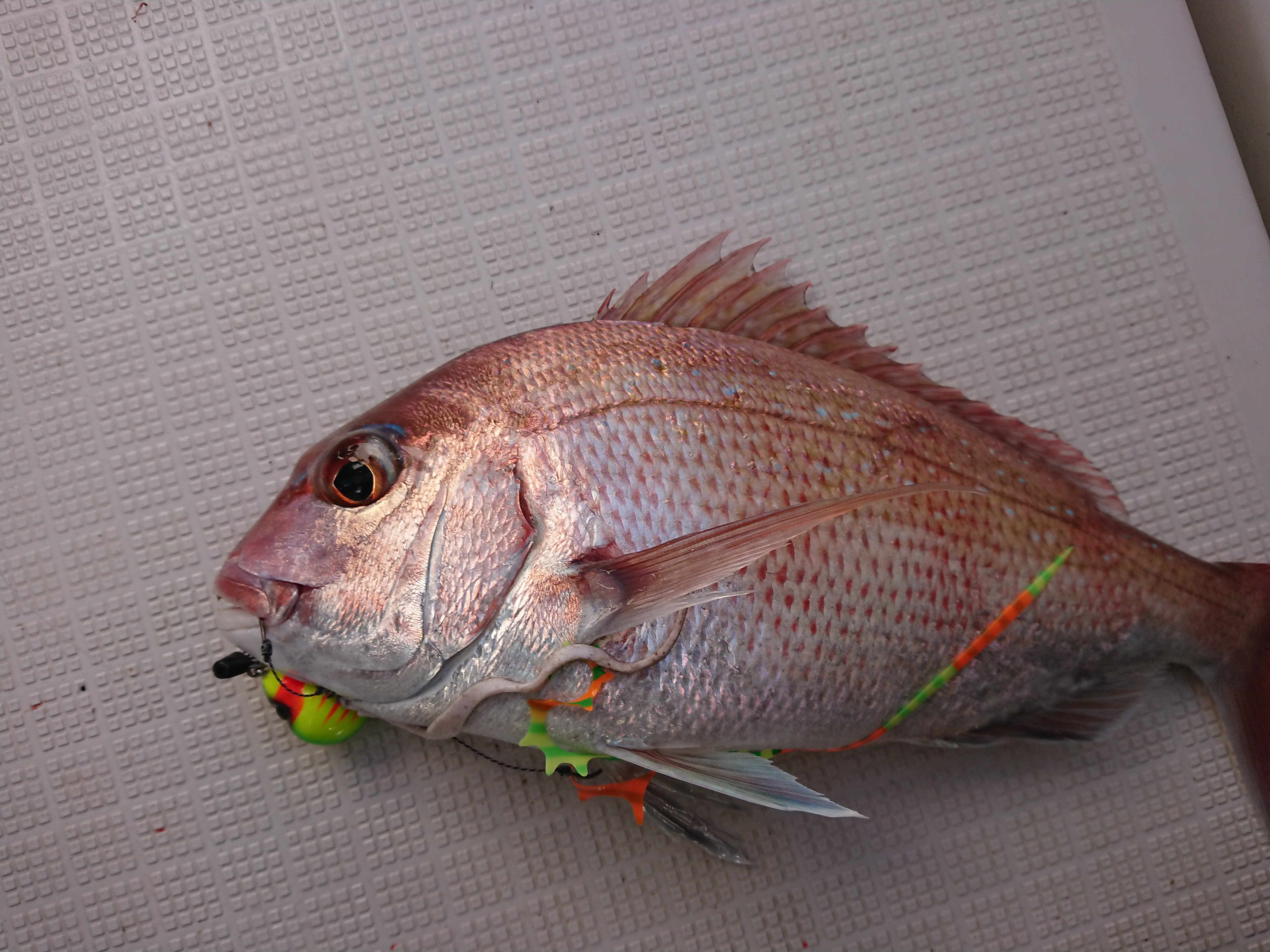 先ほどよりだいぶ小さいマダイだった。「さっきの大きいのより引きましたね。」とか言いながらランディング。この1匹を最後に終了となった。