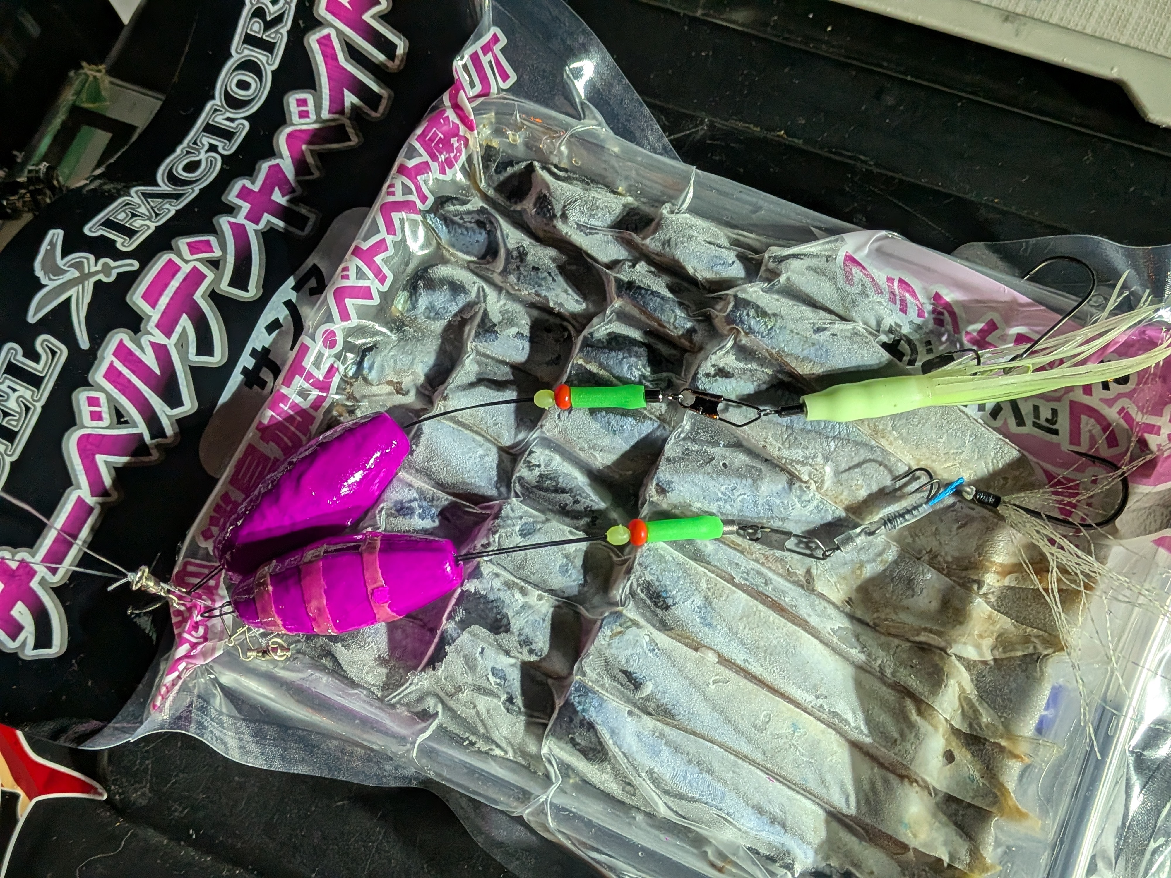とにかく熟成タイラバアクアがキモ。僕はこの色しか持っていなかったが絶好調だった。他にUVパールヒイカ使っていた方も居てそちらも爆釣。