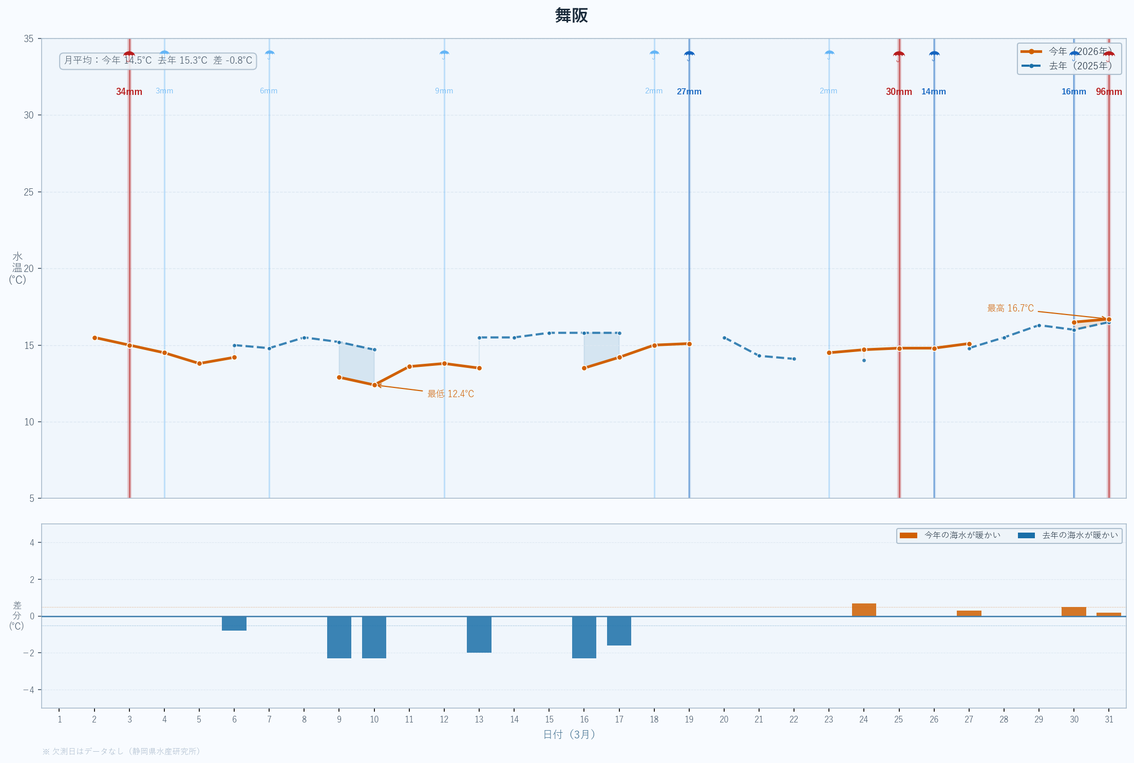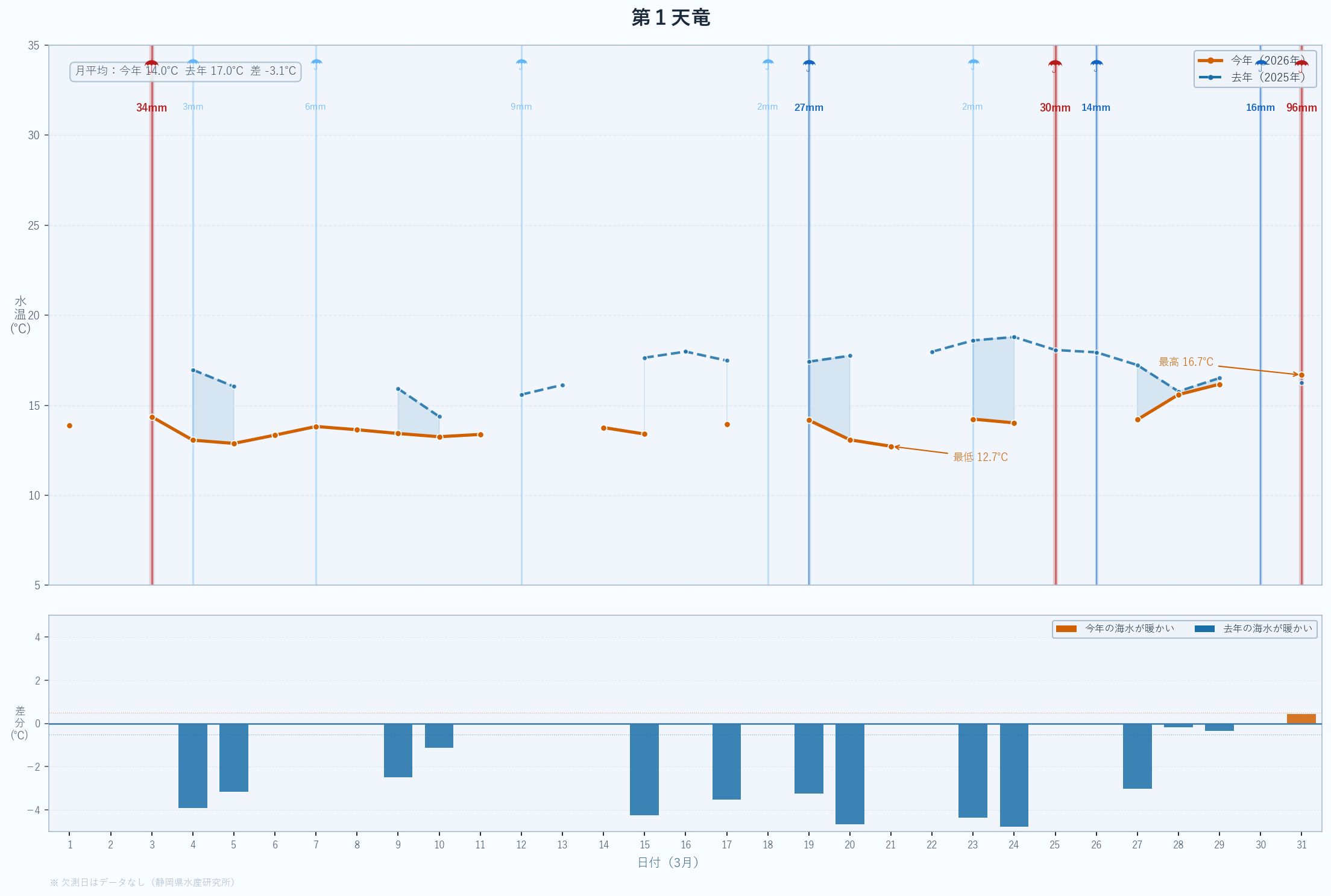 | 月間平均 | 14.0 | 17.0 | +0.9 | -3.1 | – |