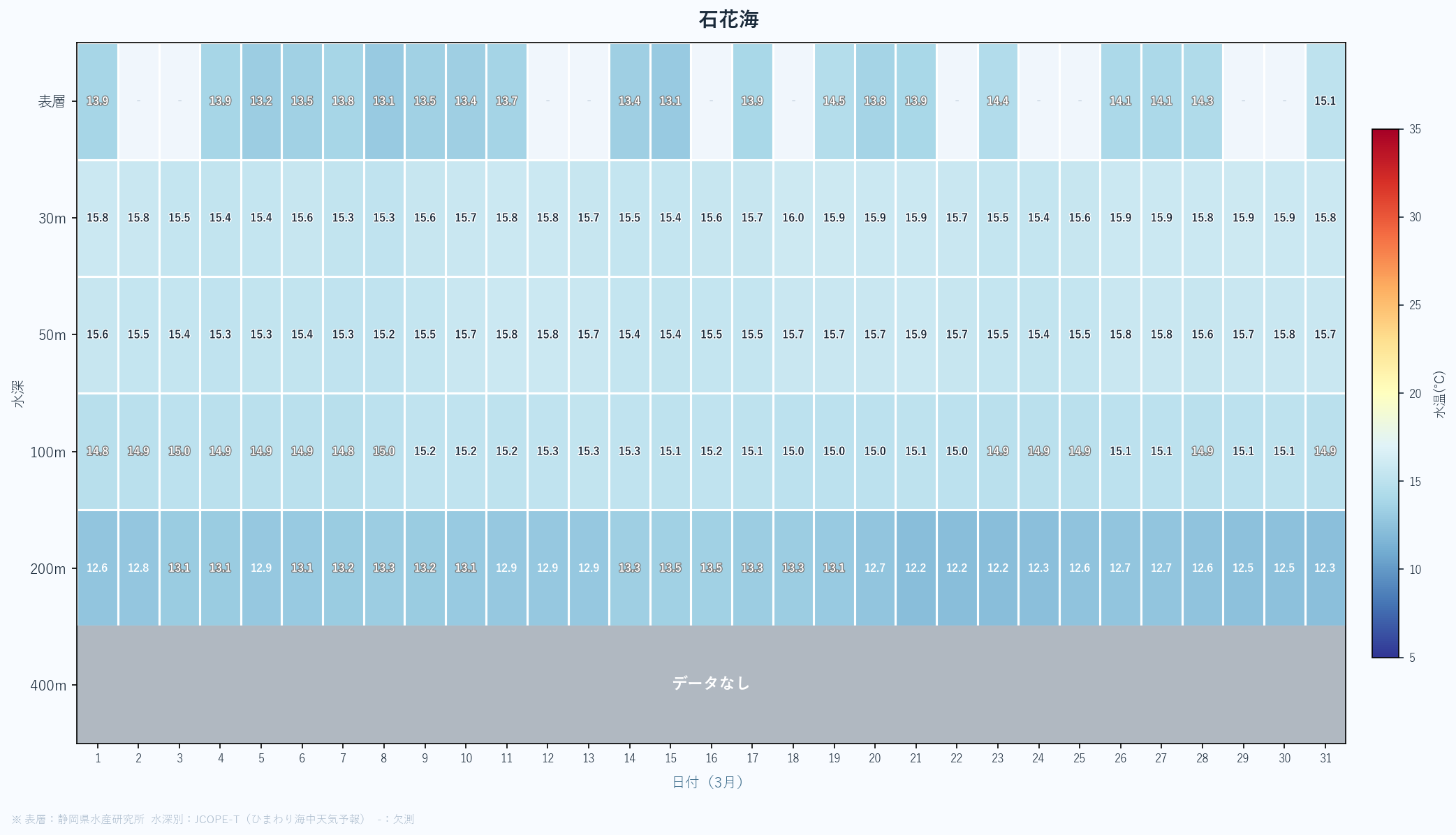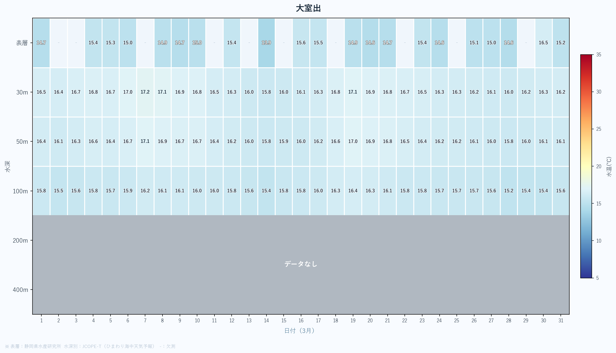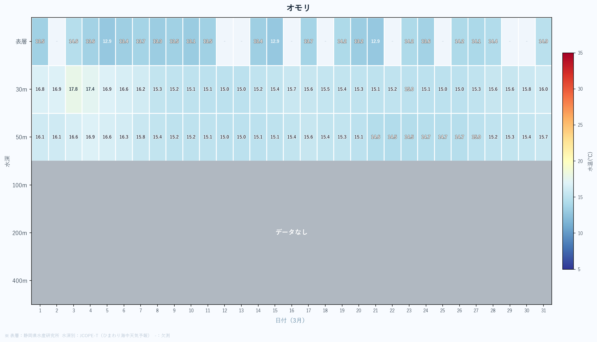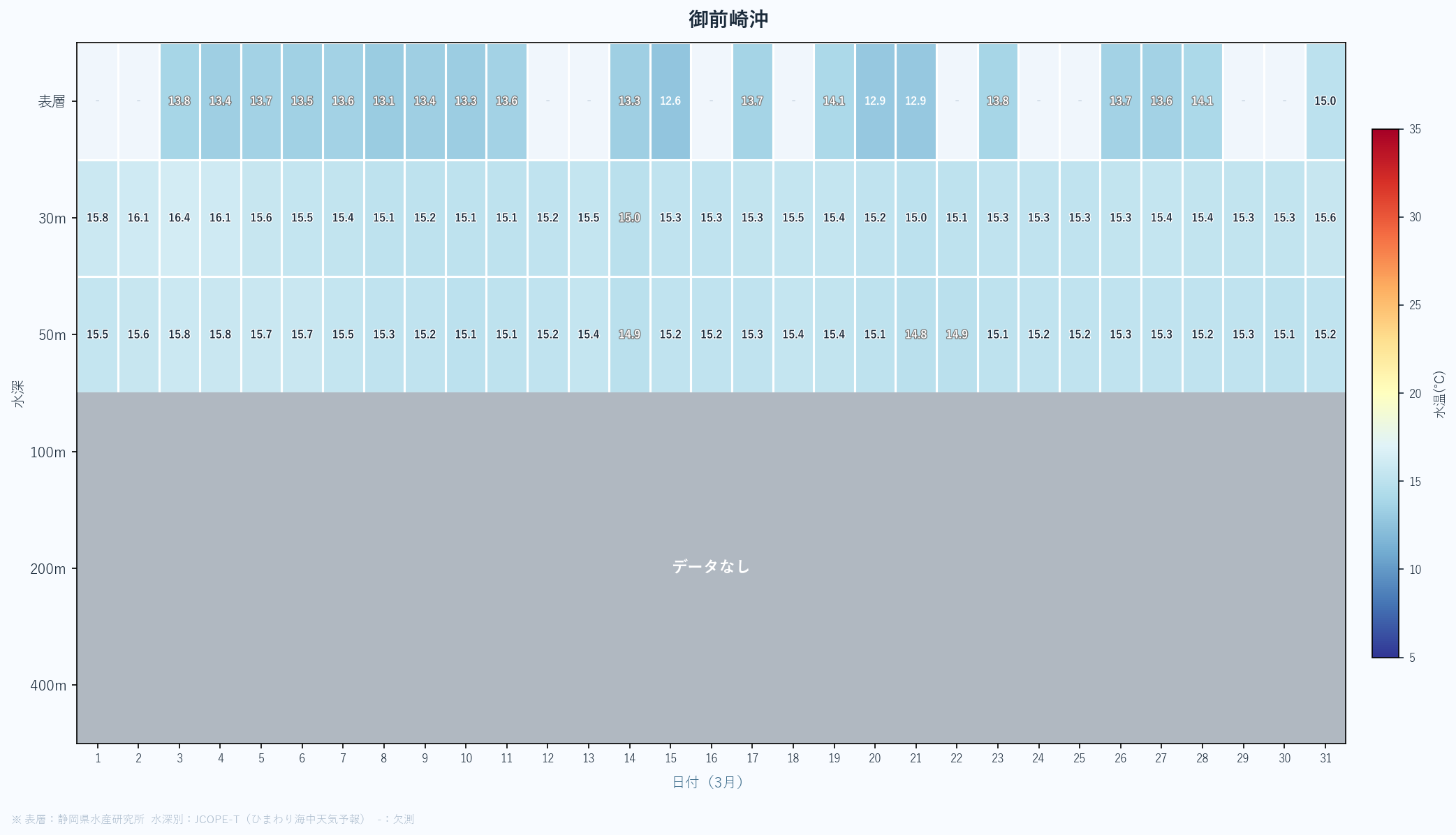 - 月末の急上昇は春の黒潮接近の可能性あり。4月以降の大きな変化に注目。深場100mも16℃近くまで上昇している。