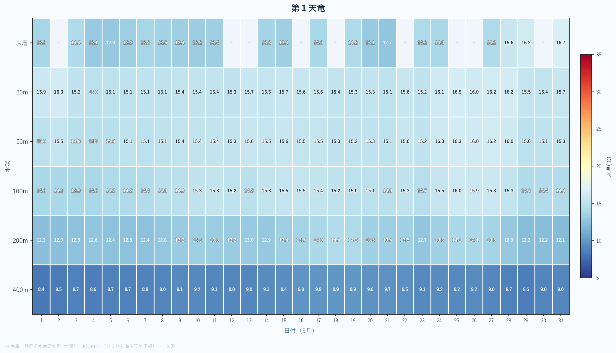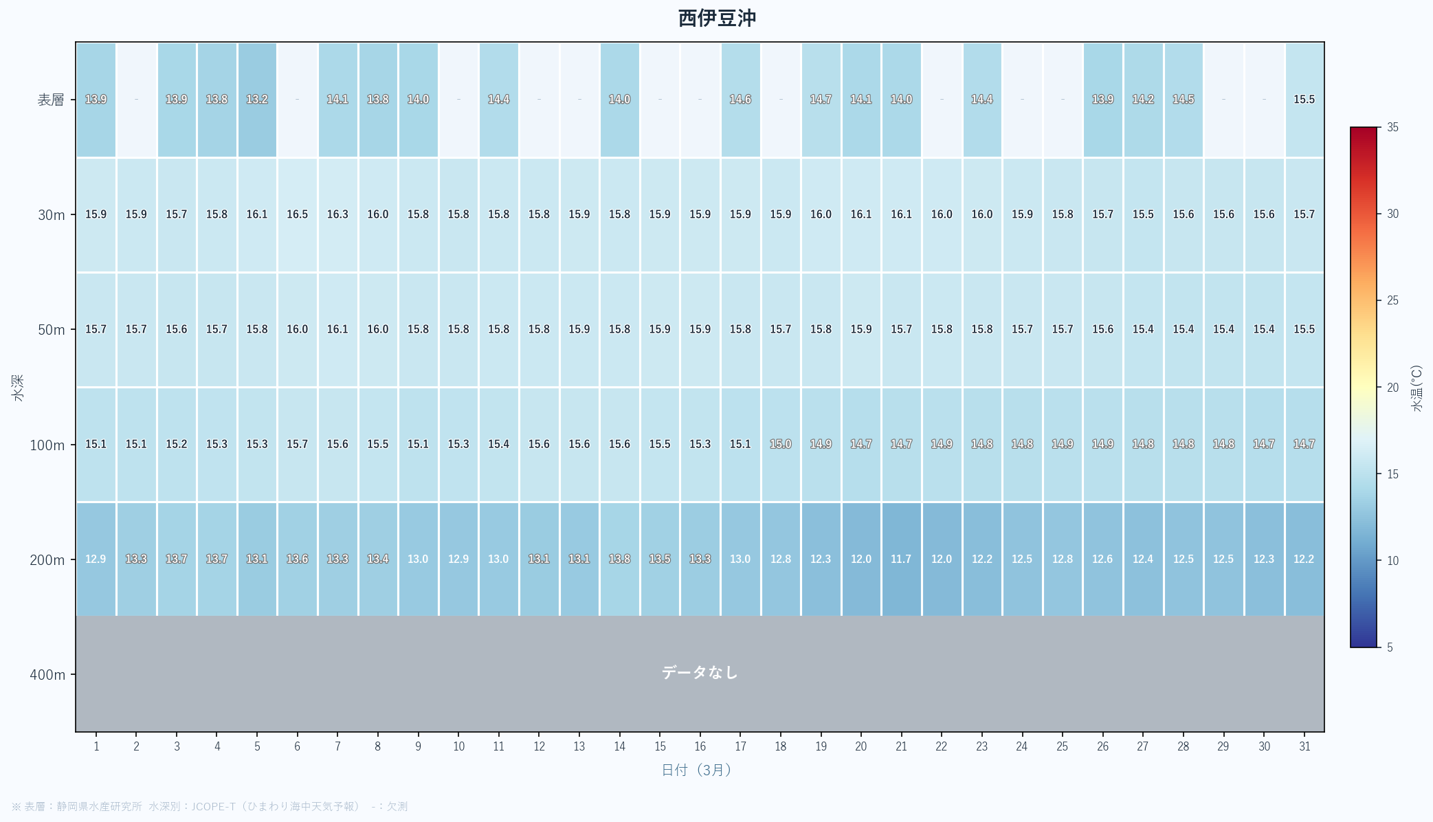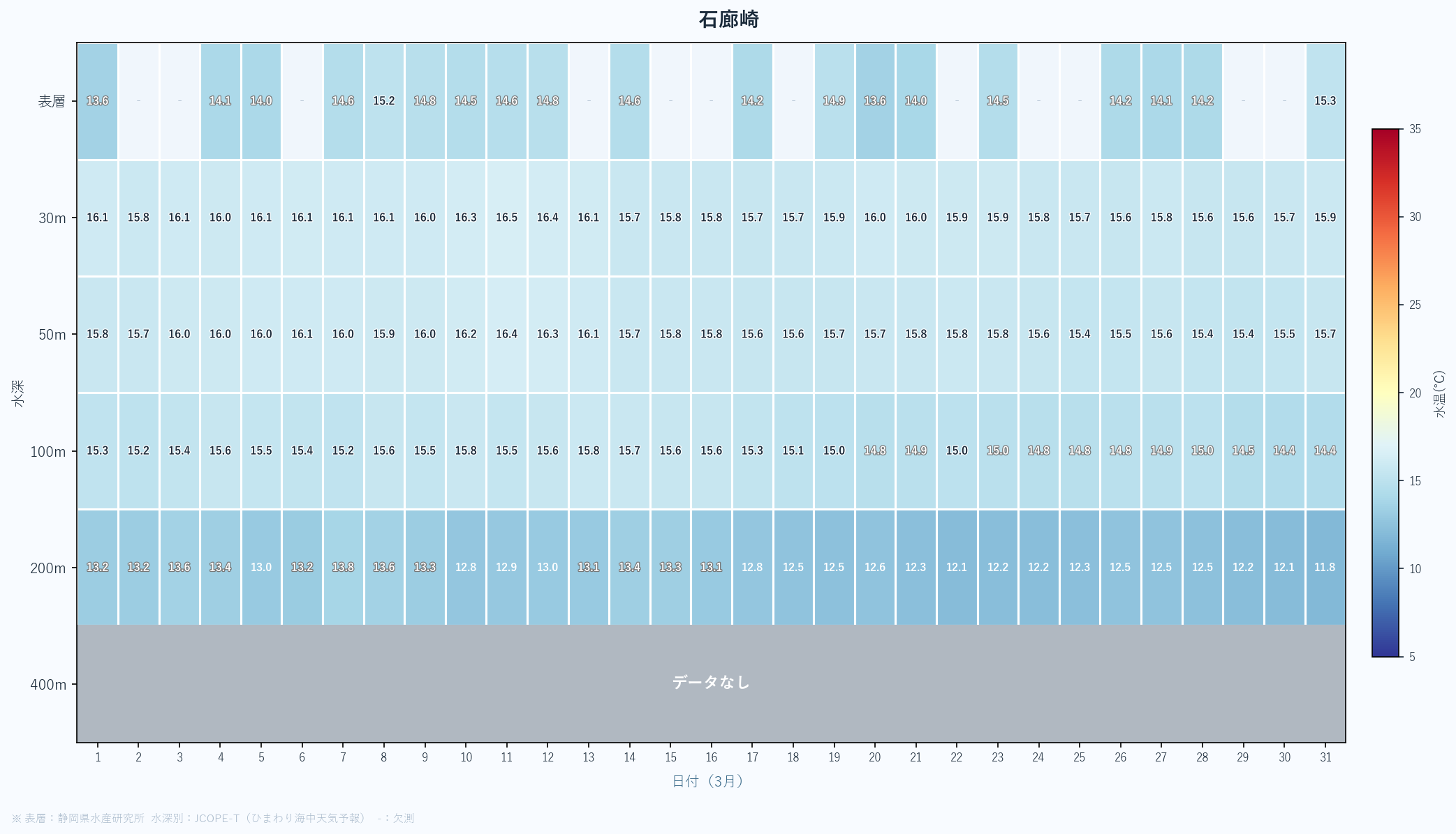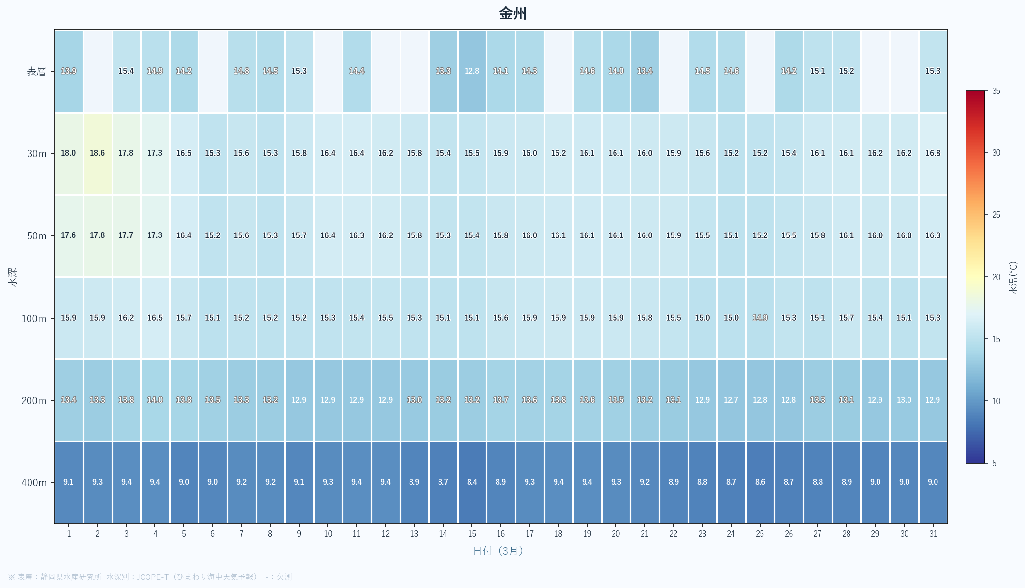 - 月末の急上昇は春の黒潮接近の可能性あり。4月以降の大きな変化に注目。深場100mも16℃近くまで上昇している。