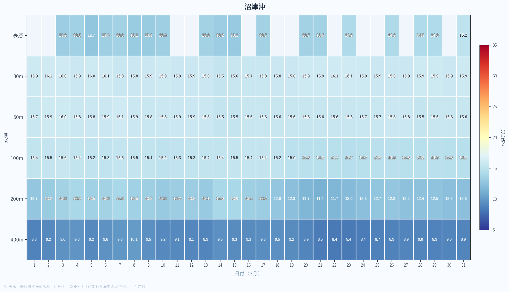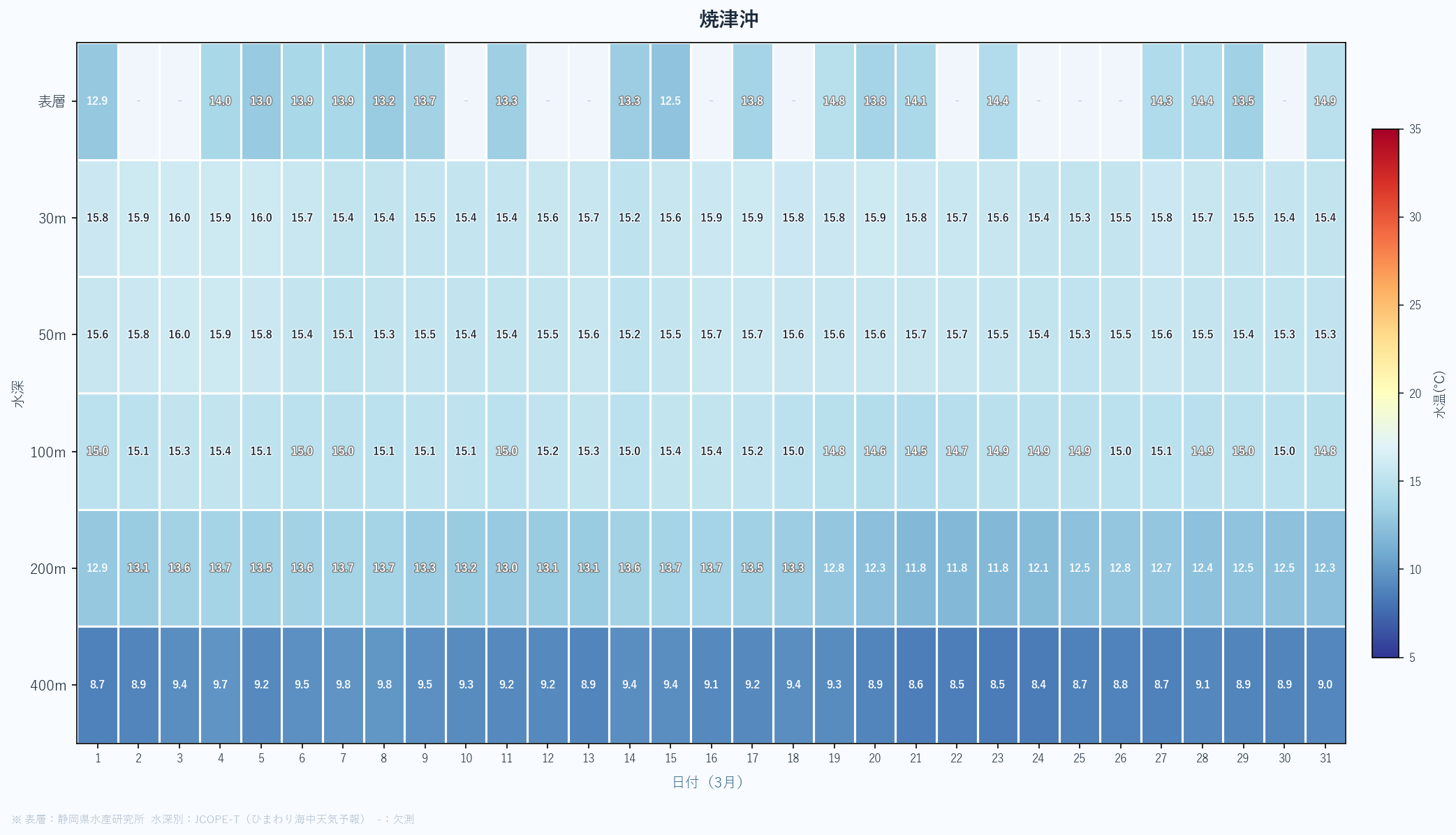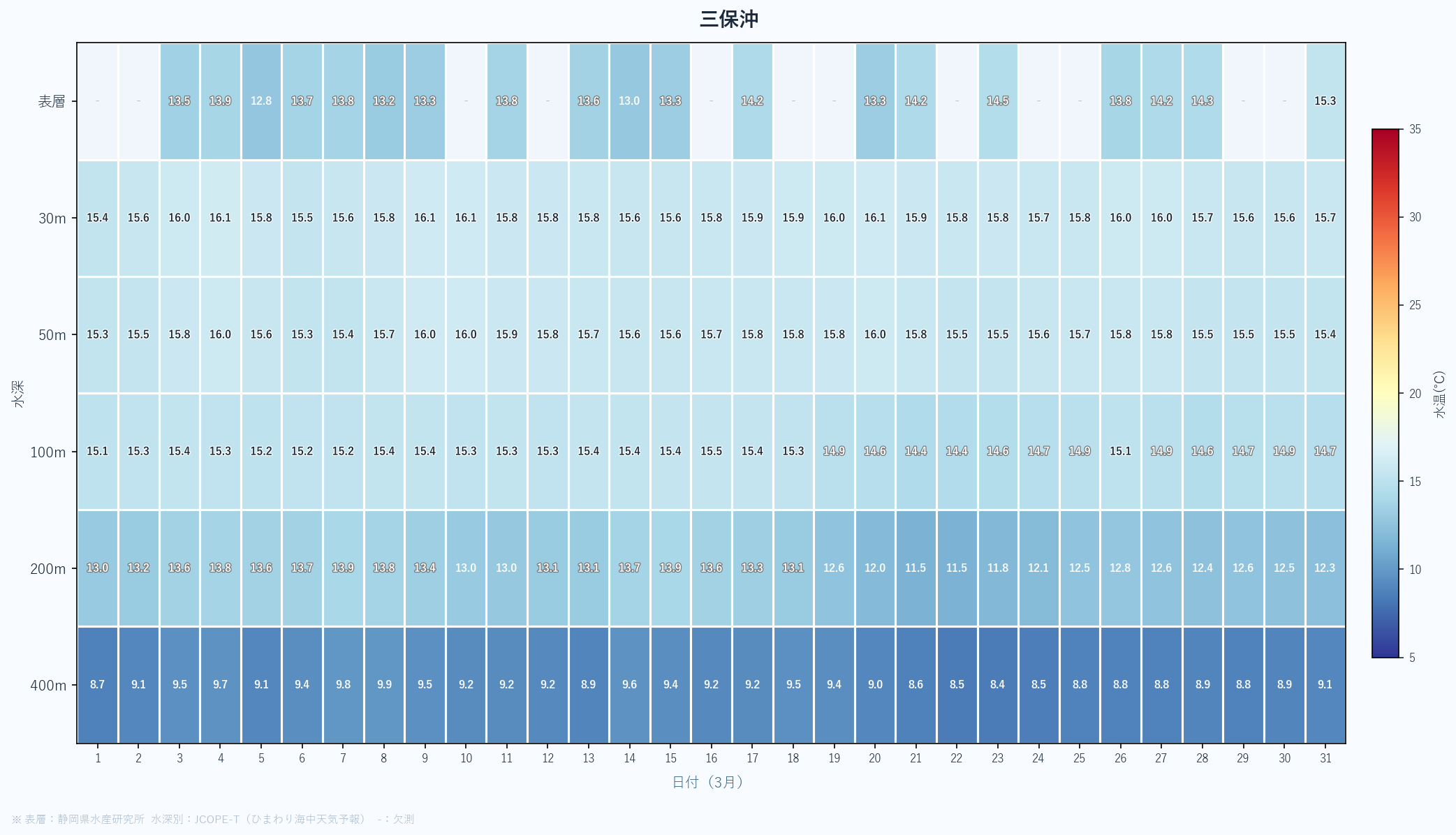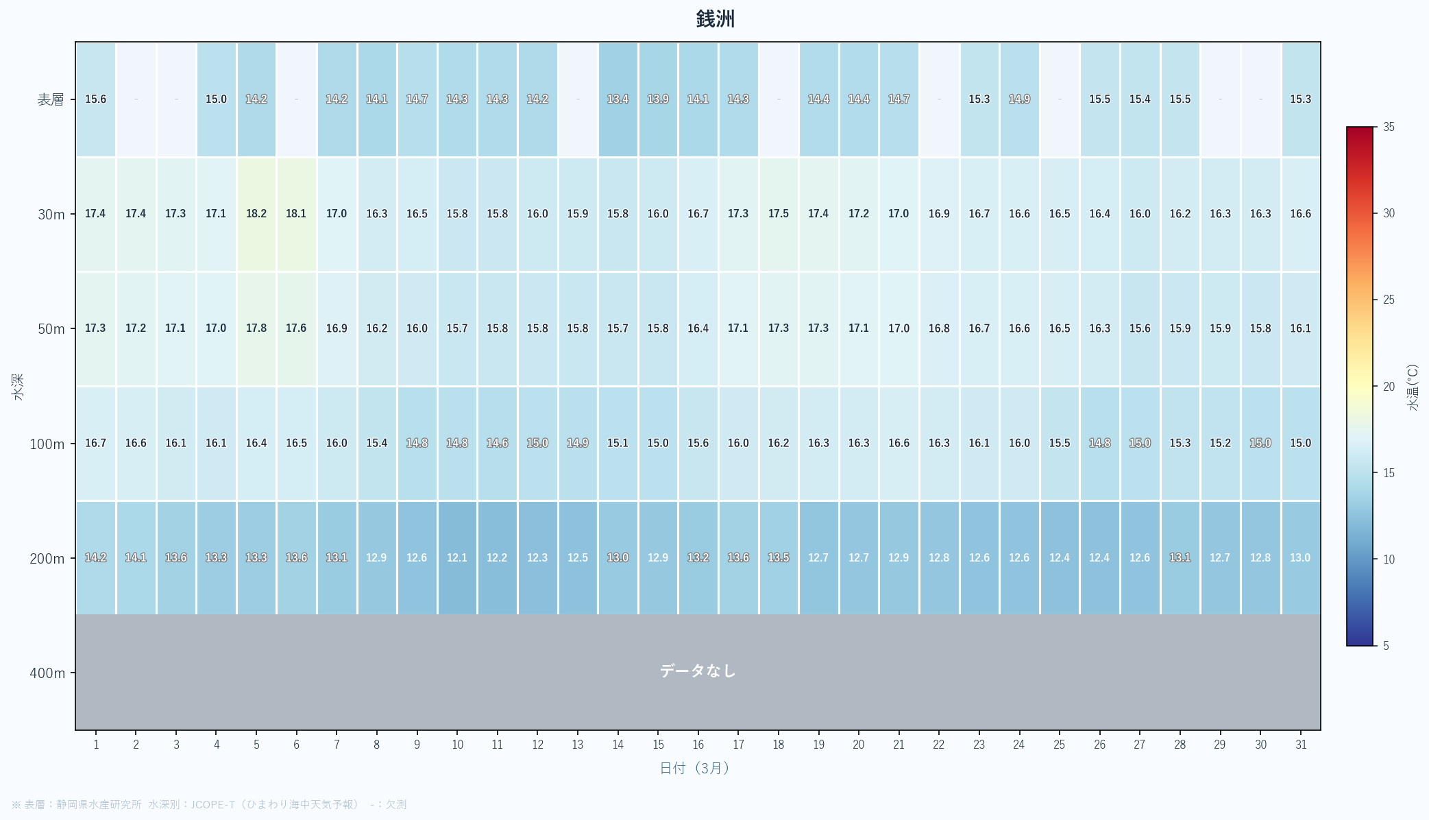 - 月末の急上昇は春の黒潮接近の可能性あり。4月以降の大きな変化に注目。深場100mも16℃近くまで上昇している。