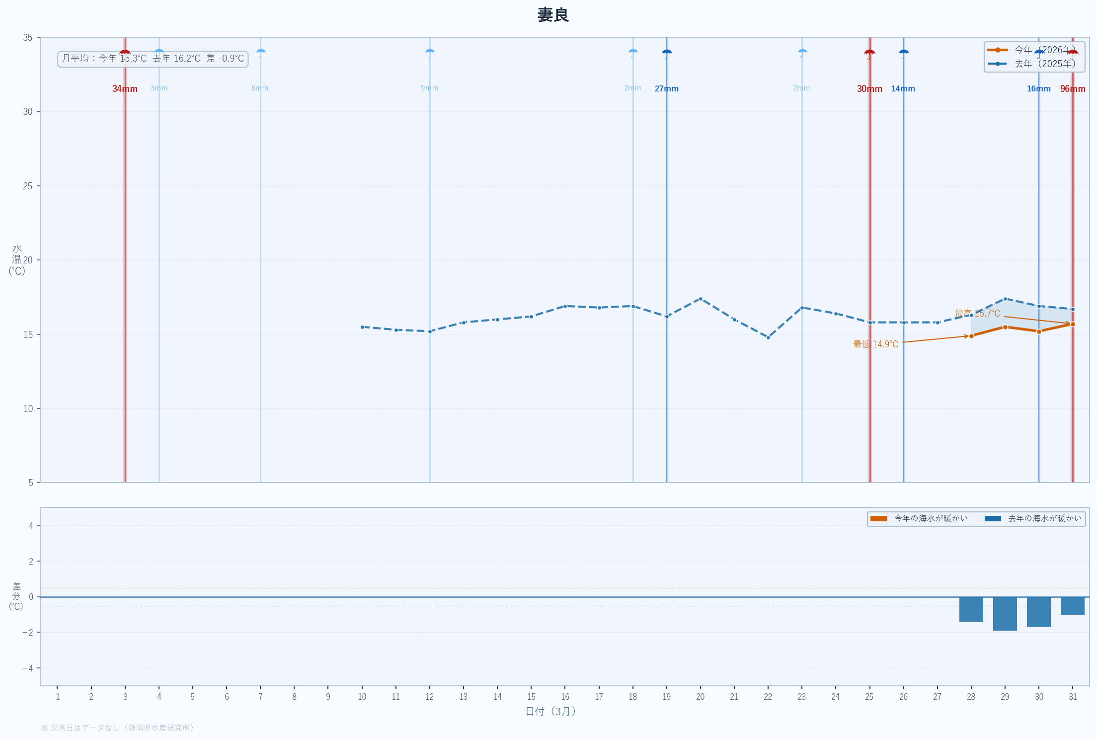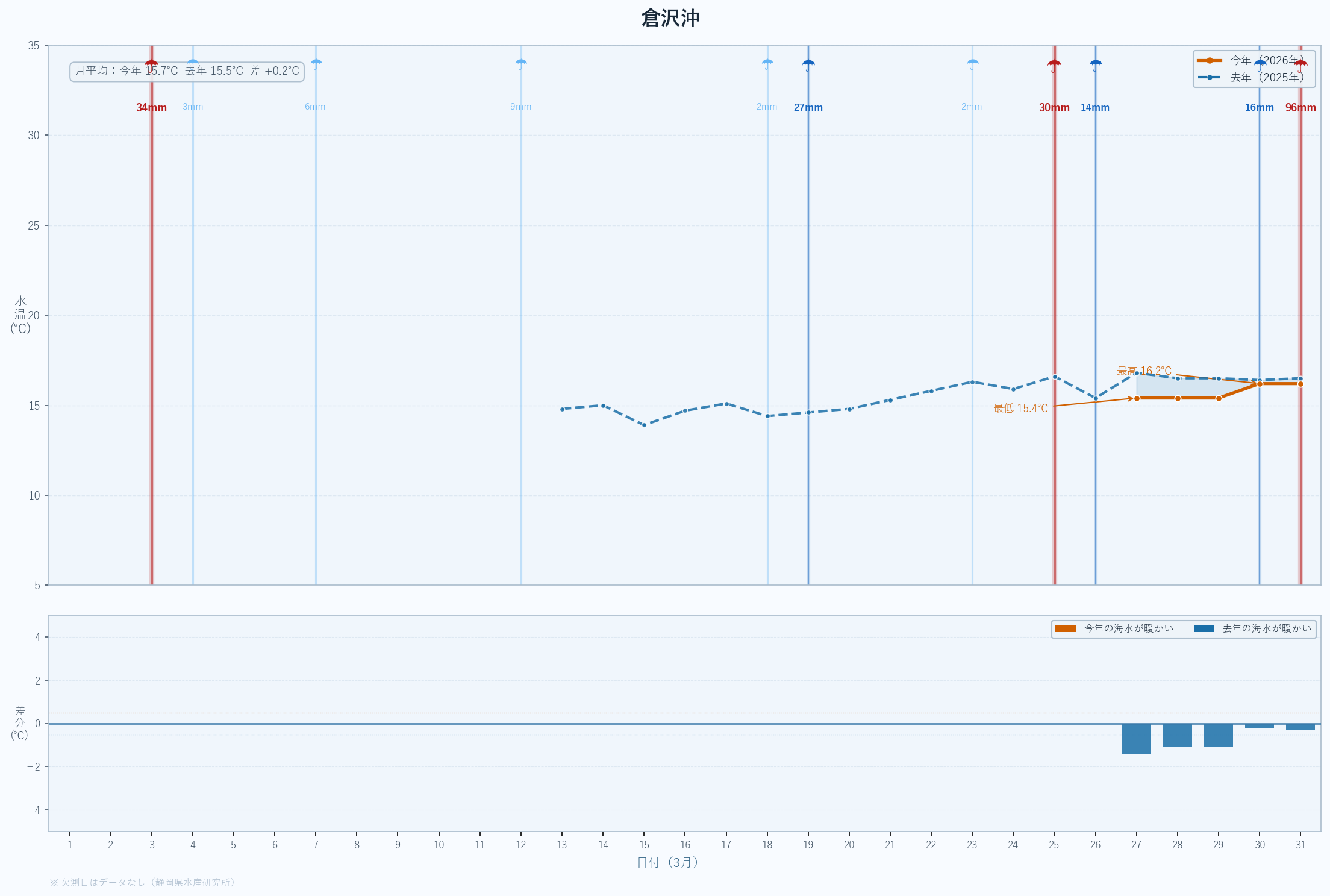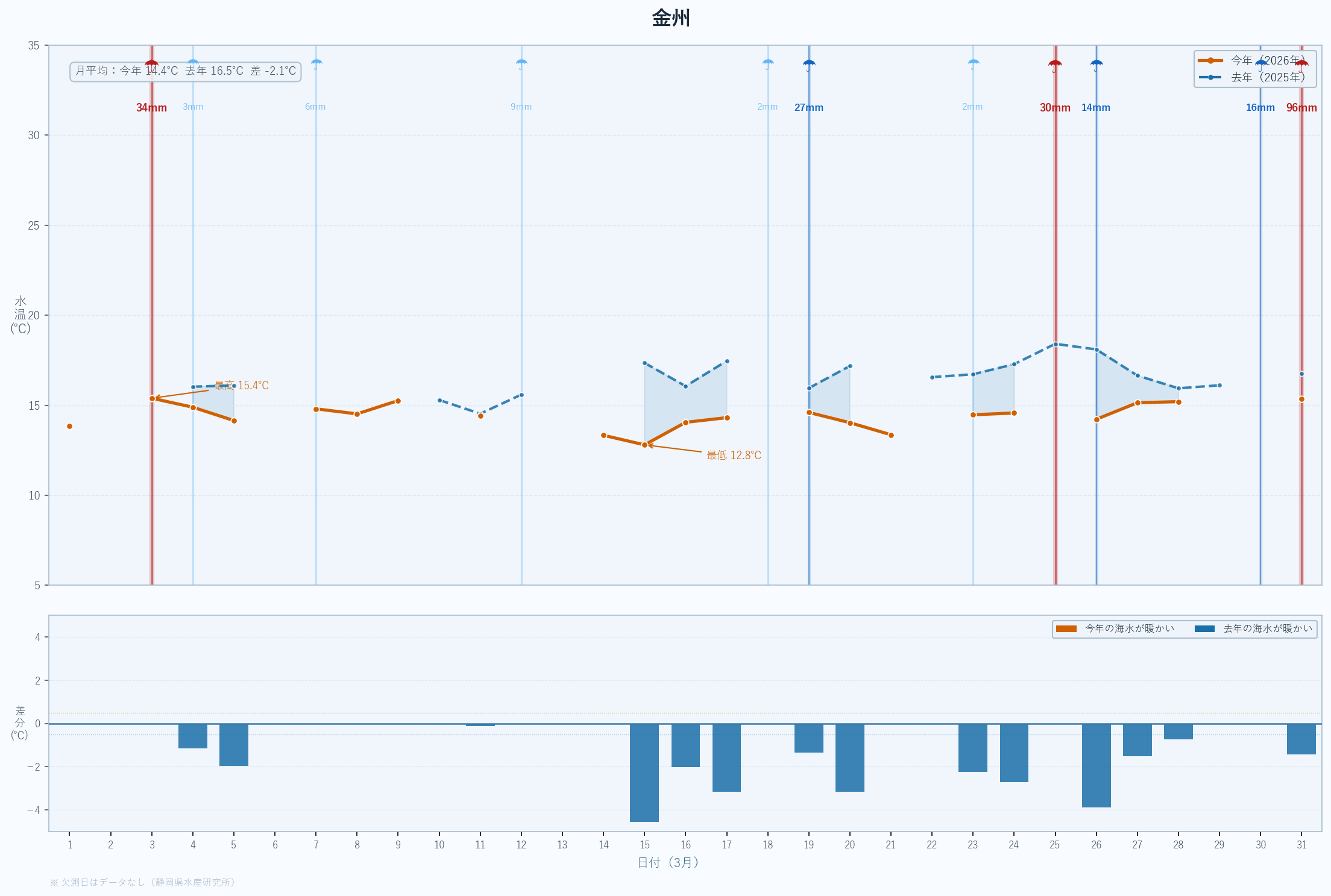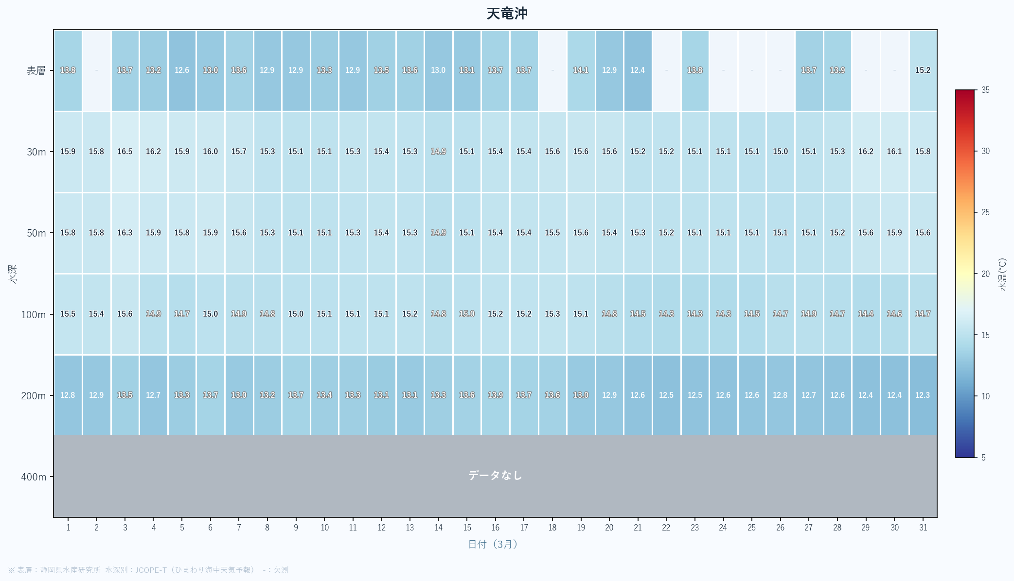 - 月末の急上昇は春の黒潮接近の可能性あり。4月以降の大きな変化に注目。深場100mも16℃近くまで上昇している。