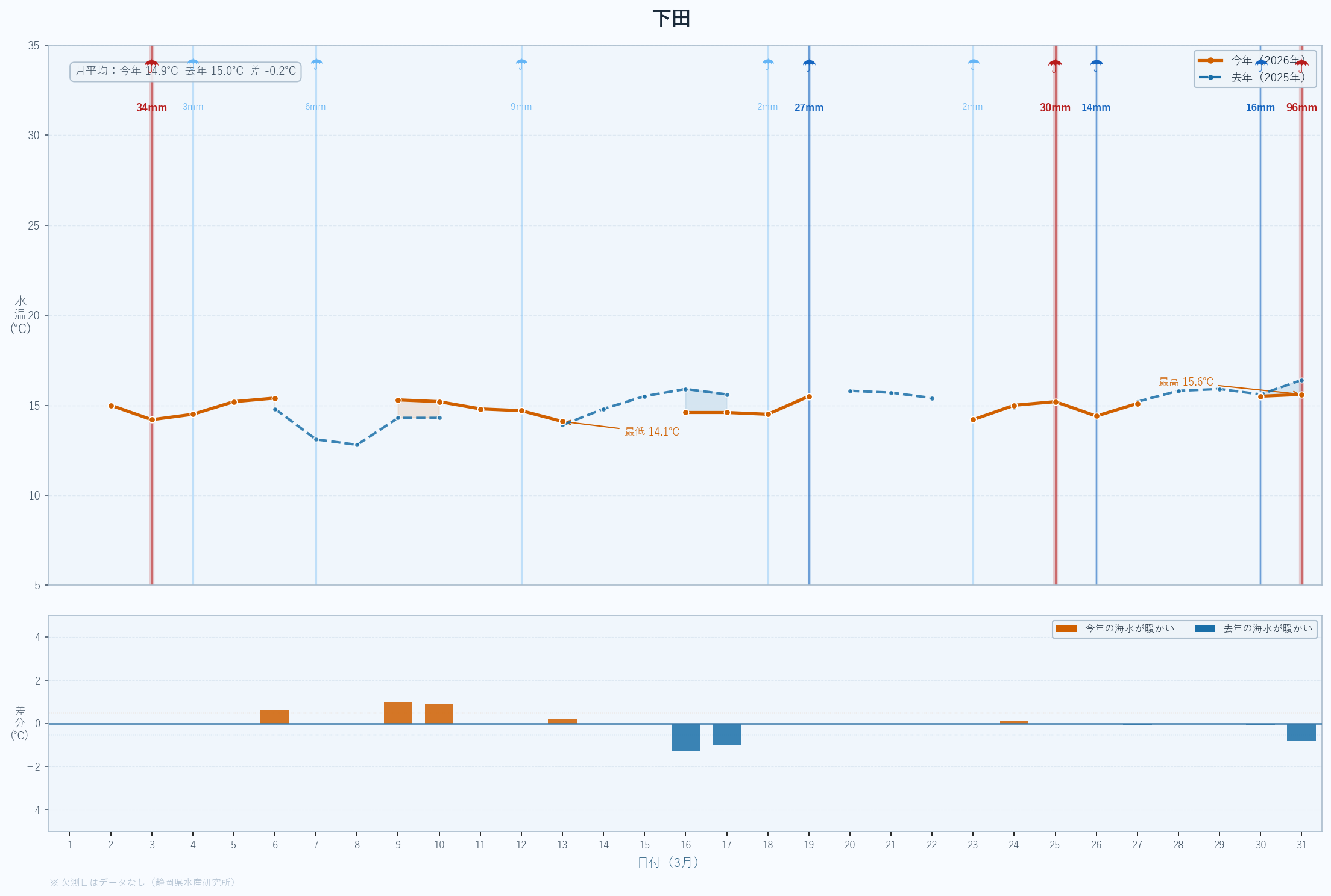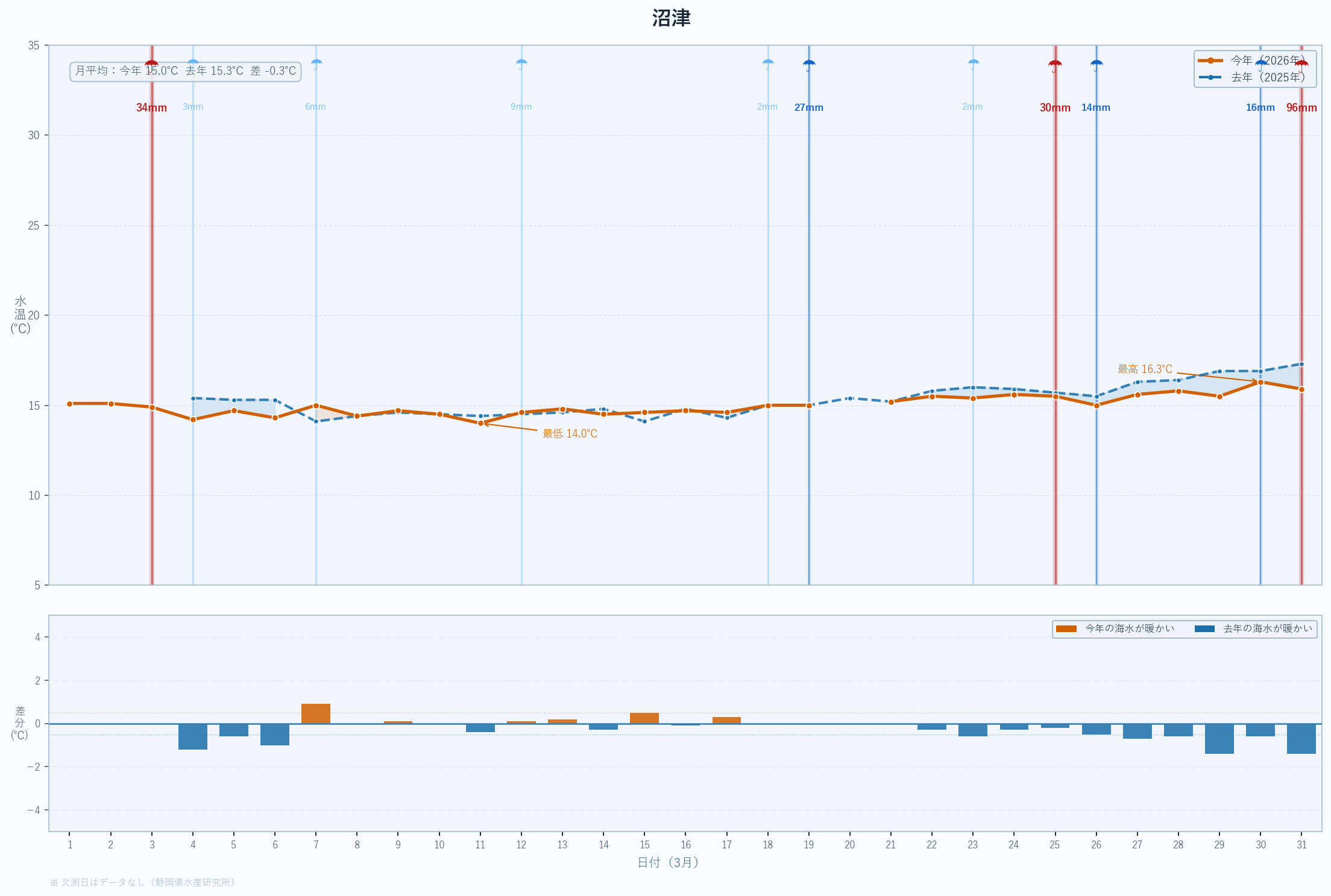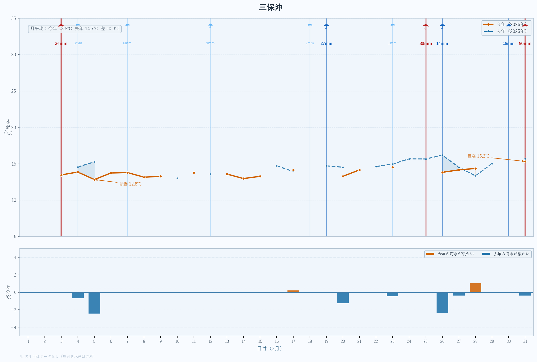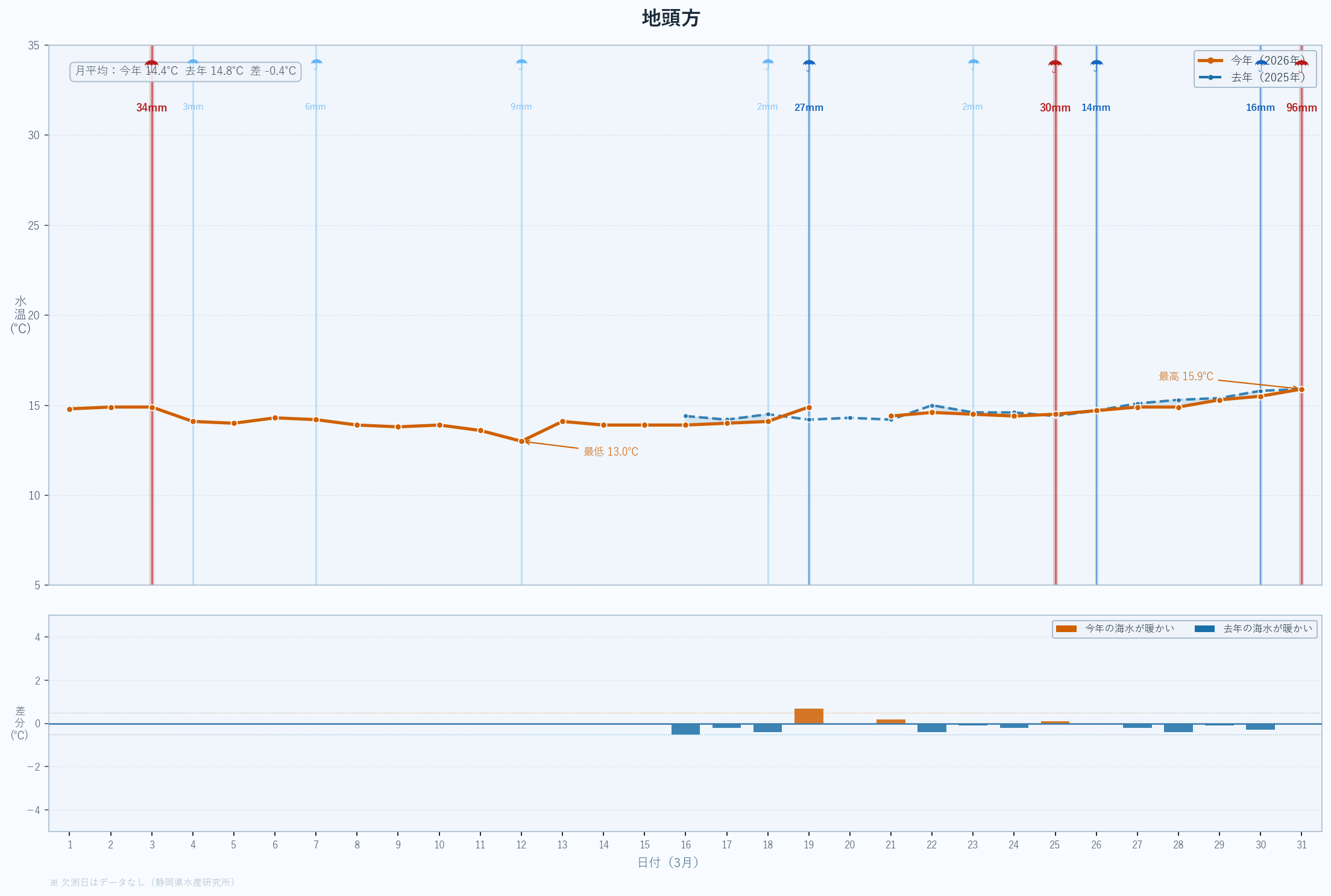 | 最低 | 13.9 | 14.2 | -0.3 | -0.3 | 3/14 |