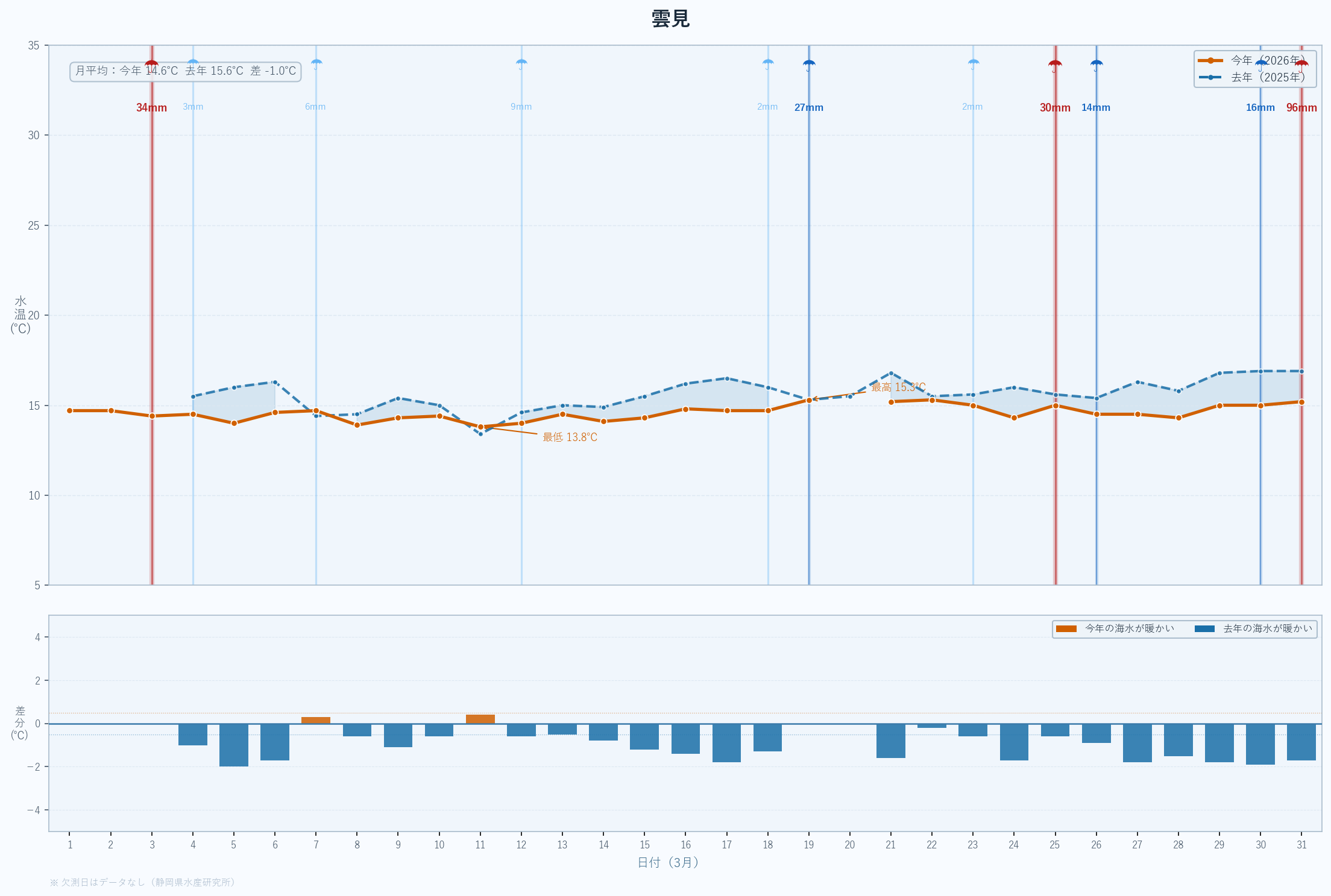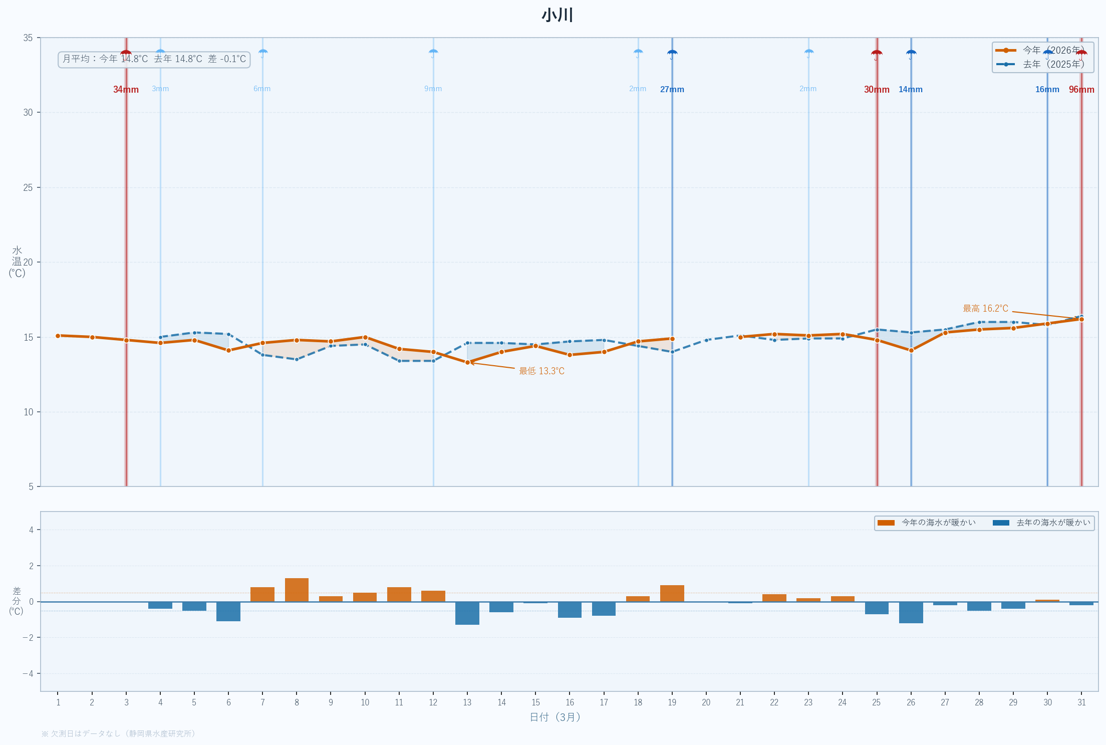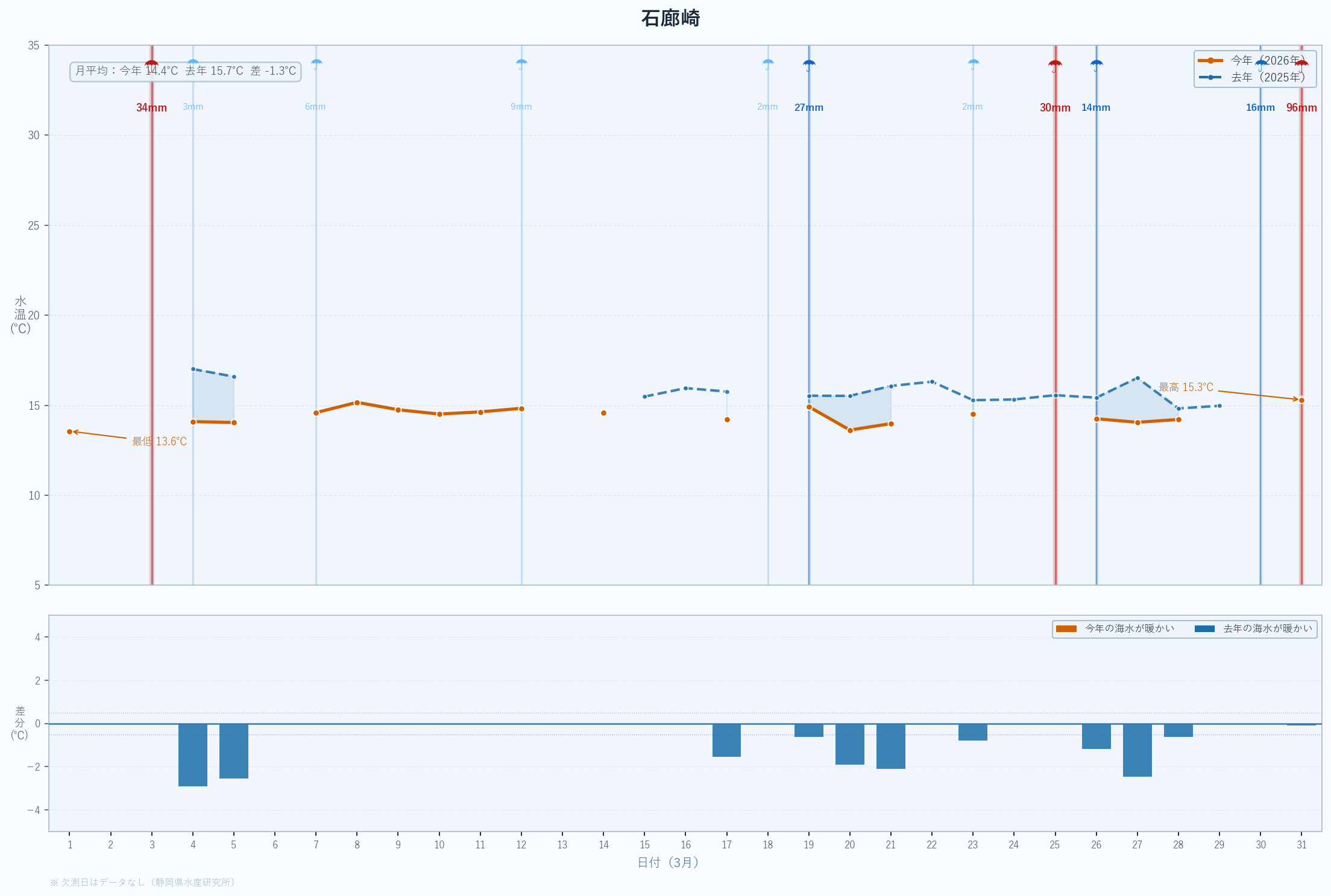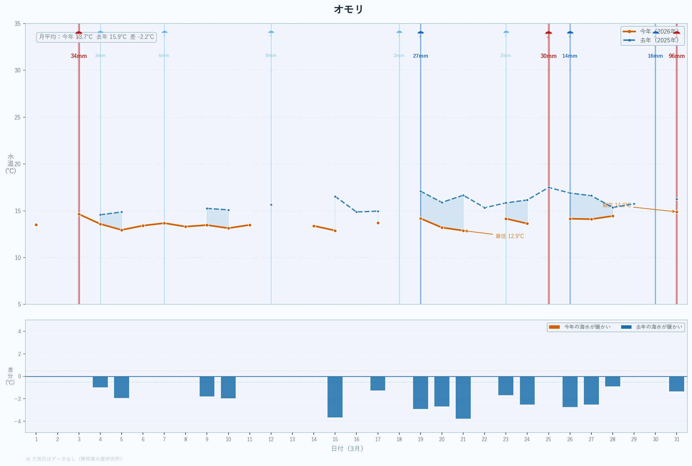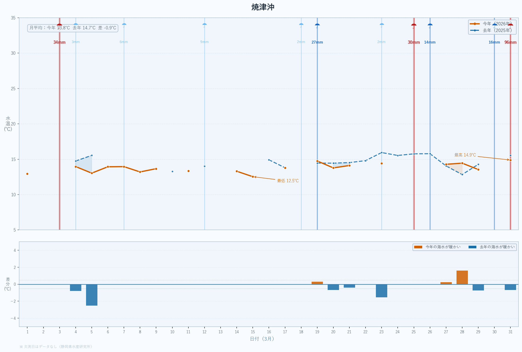 | 最低 | 13.9 | 14.2 | -0.3 | -0.3 | 3/14 |