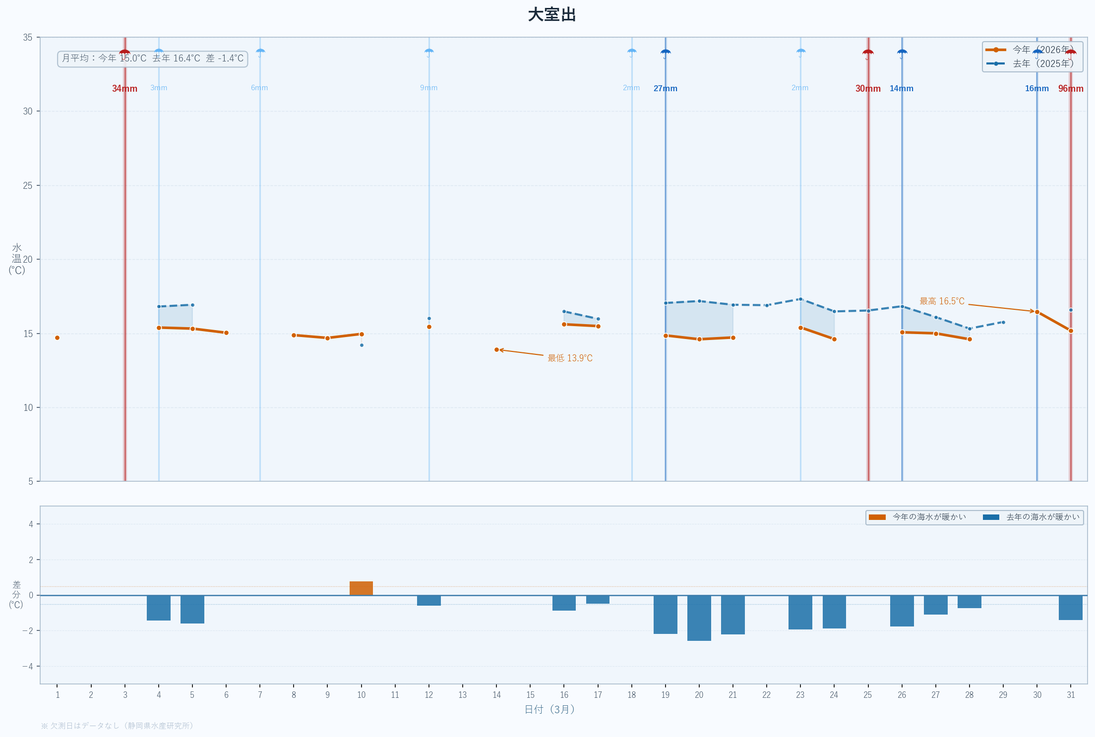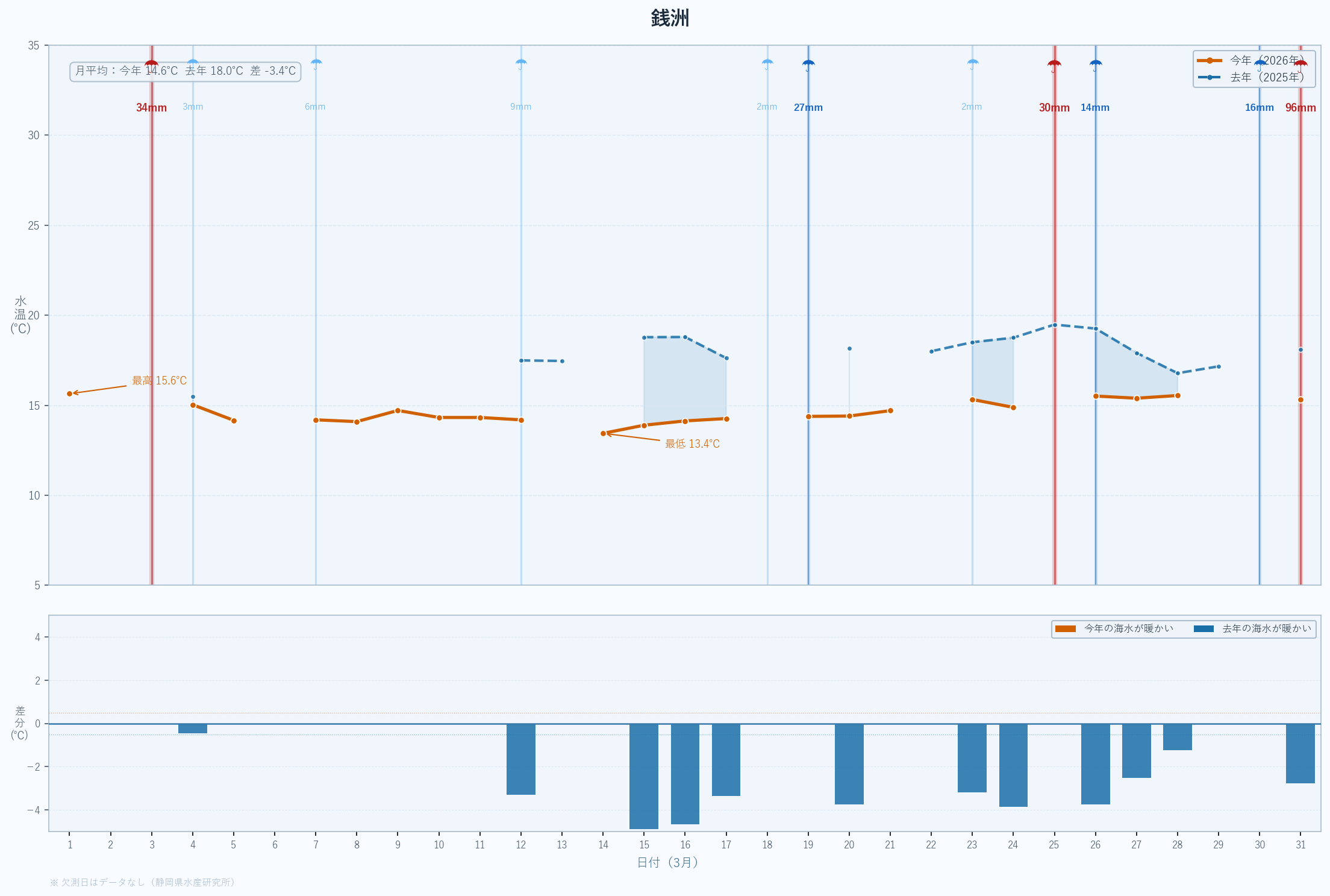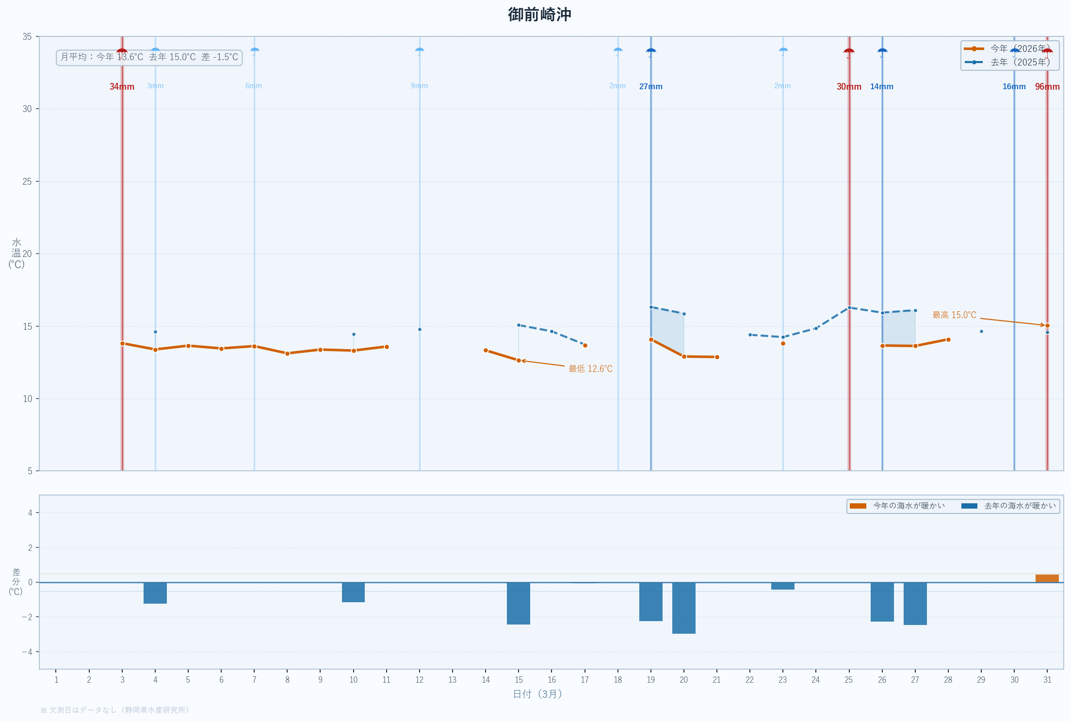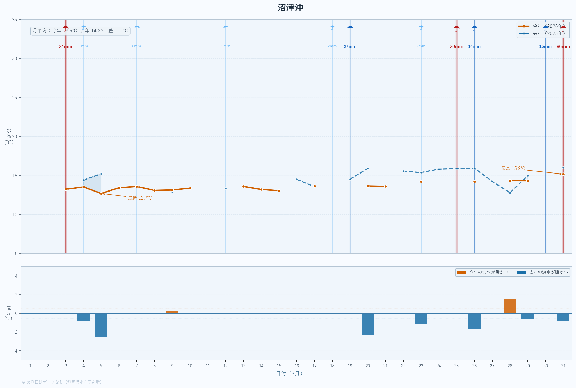 | 最低 | 13.9 | 14.2 | -0.3 | -0.3 | 3/14 |