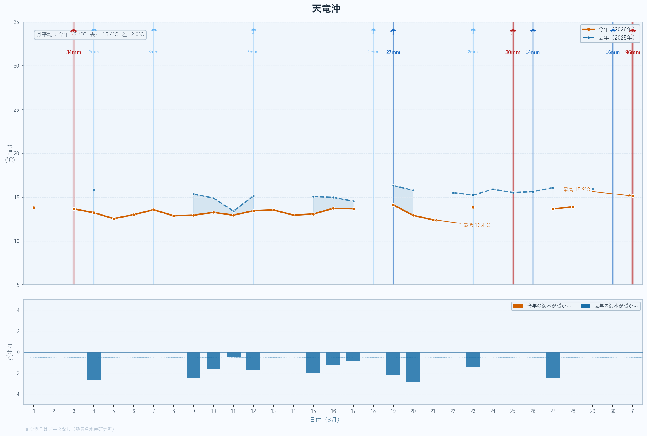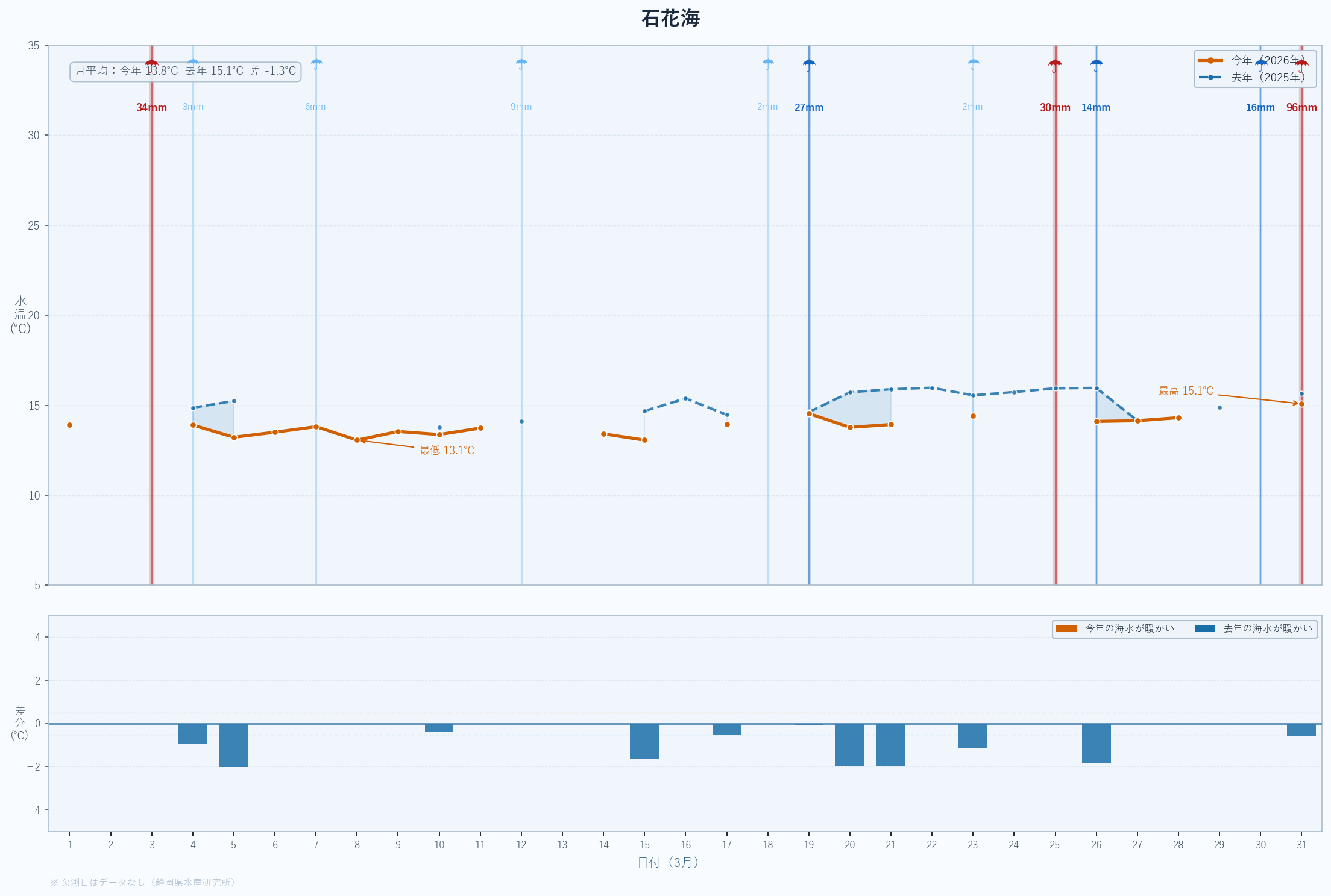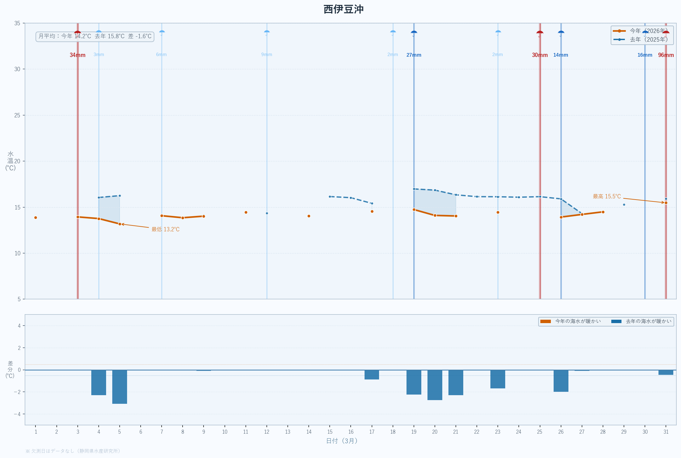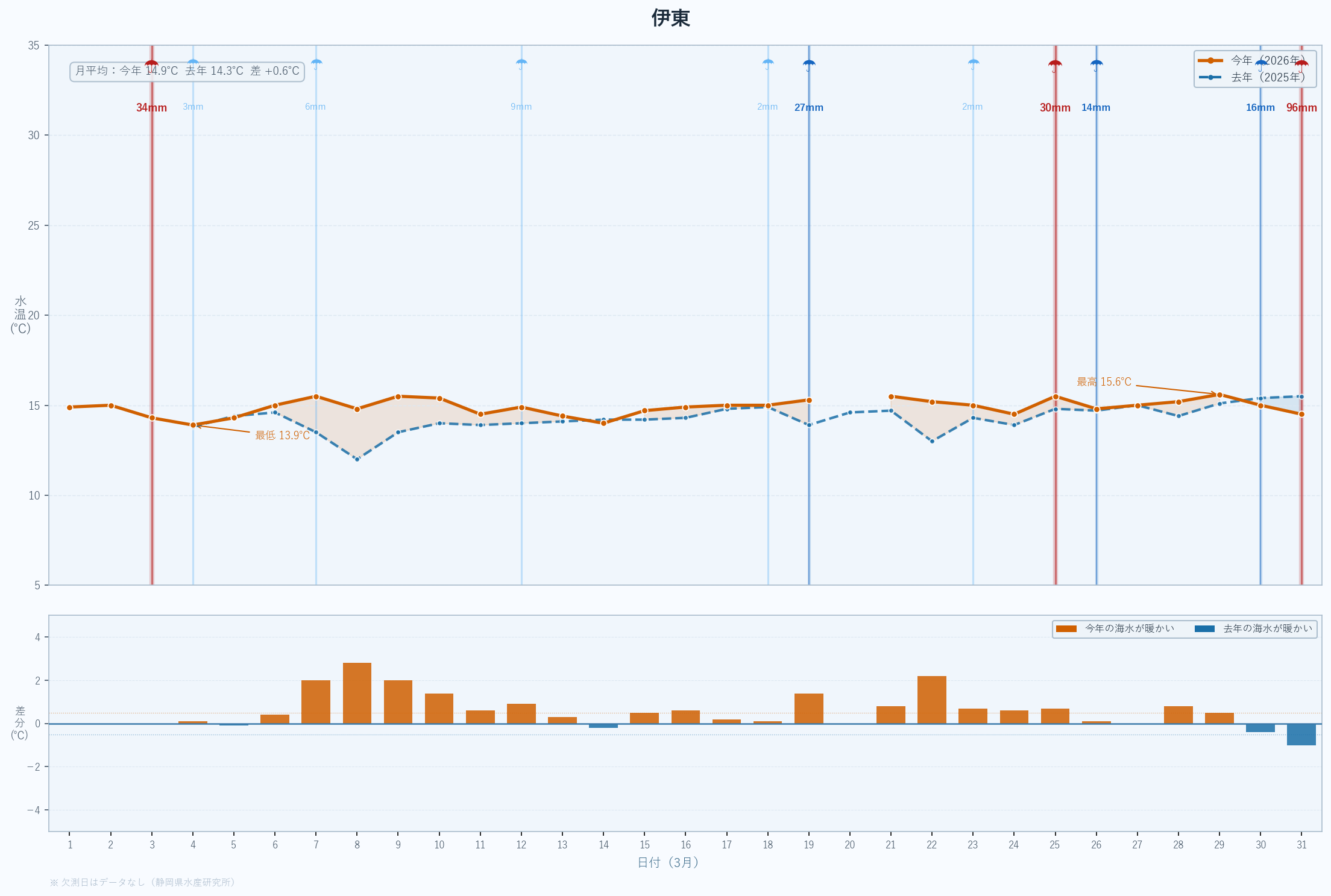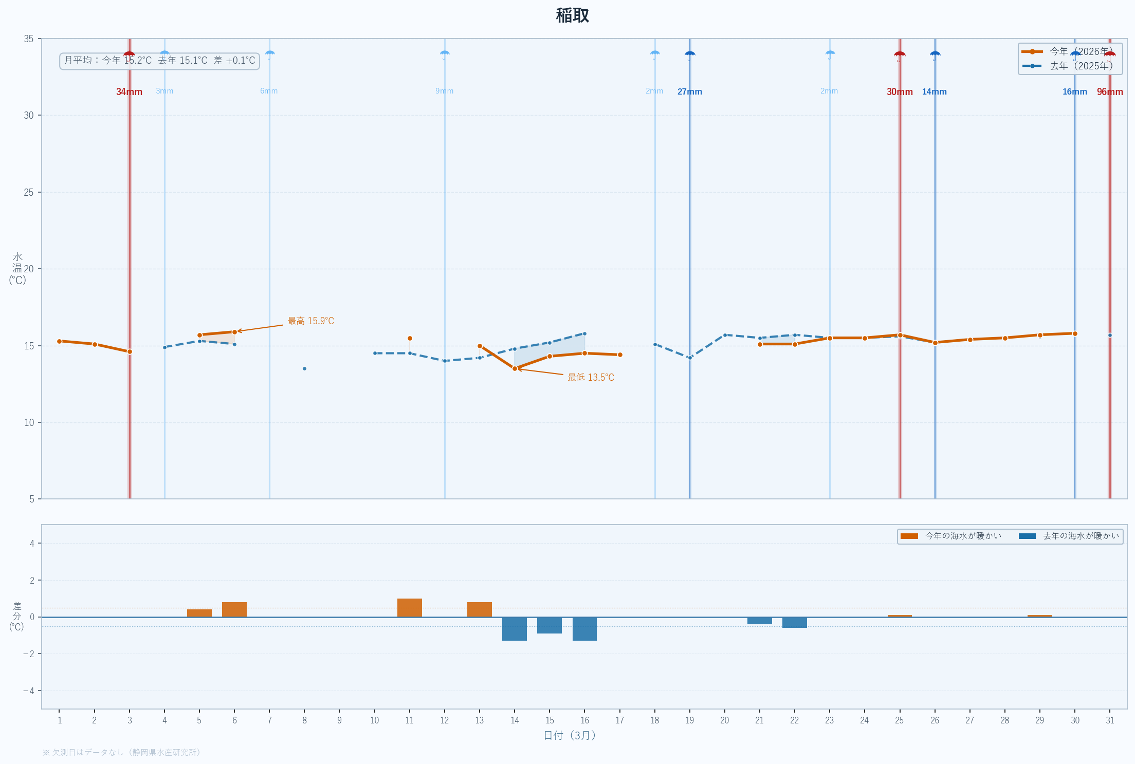 | 最低 | 13.9 | 14.2 | -0.3 | -0.3 | 3/14 |