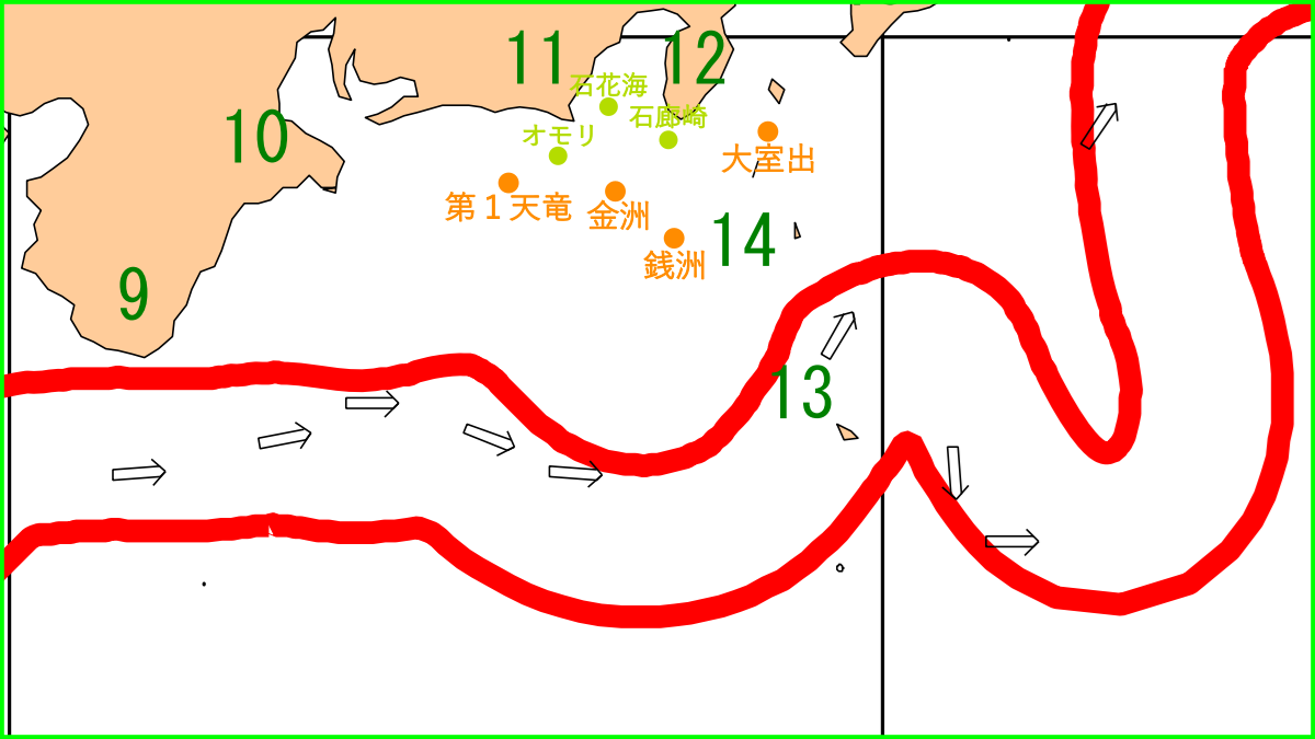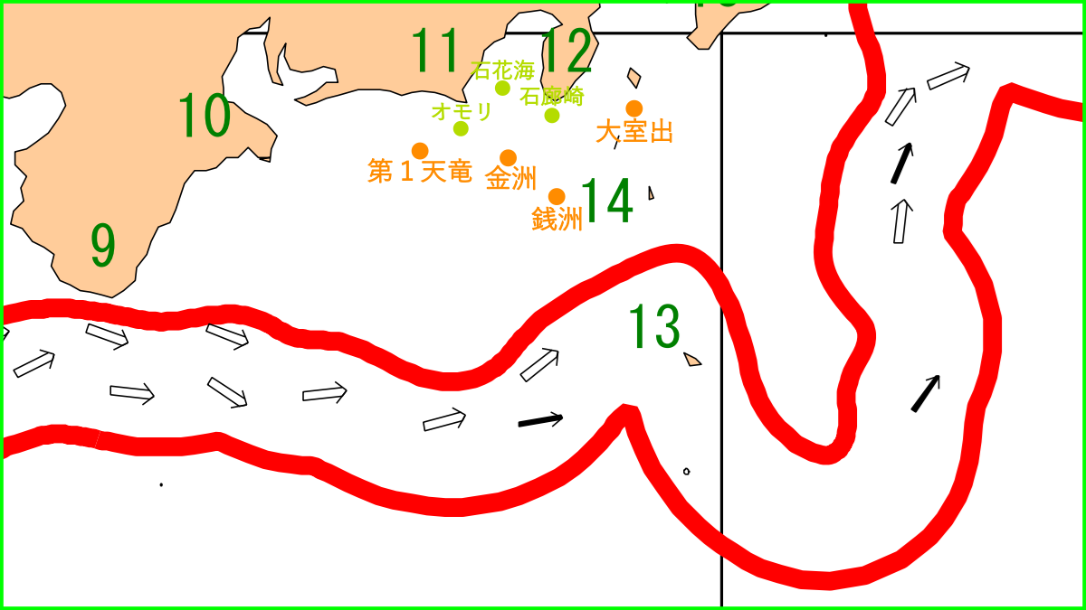 静岡県の海域(駿河湾・遠州灘・遠征海域等)の、『海のニュース』『釣果情報』『黒潮変移』『気象・気温』『海水温』のまとめと比較。